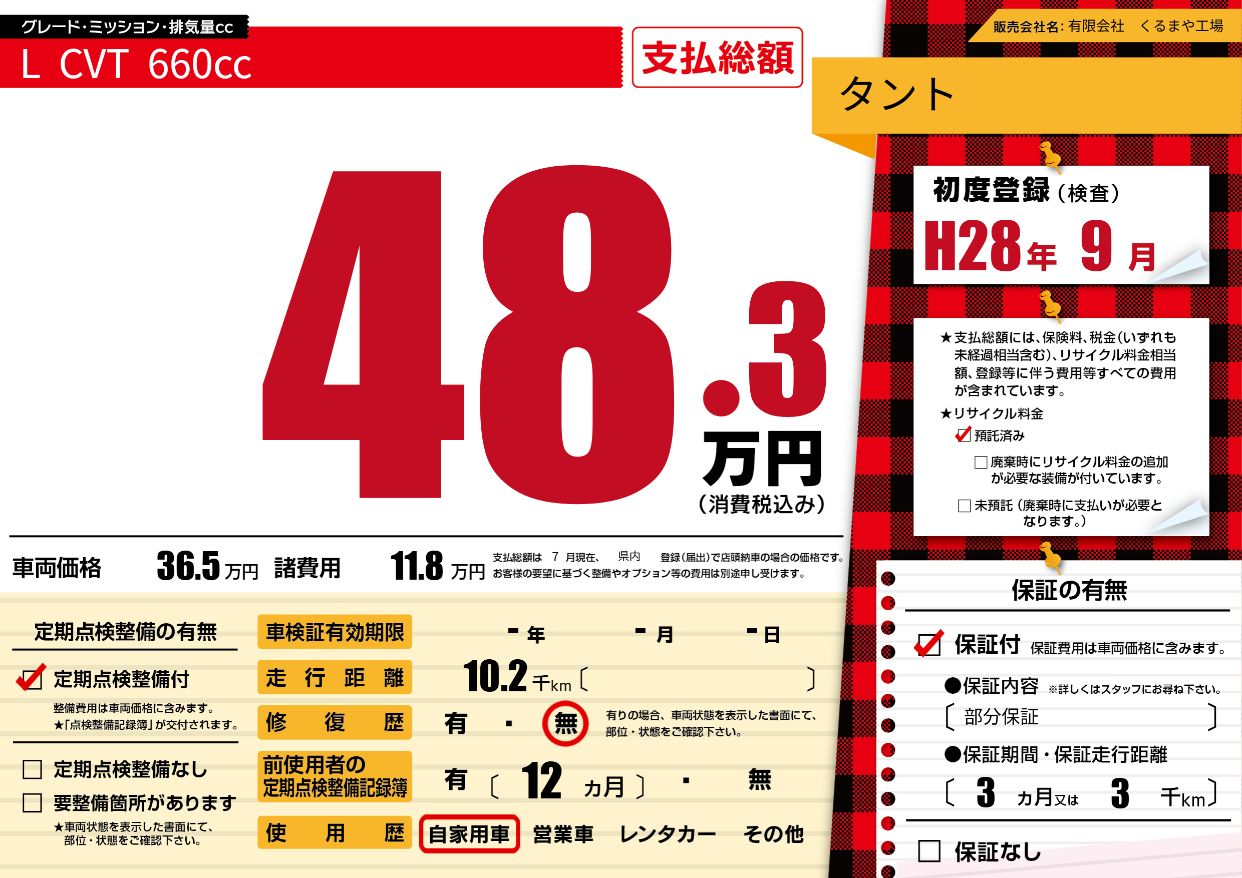 | 走行キロ | 1万km | 初年度登録 | H28年9月 |