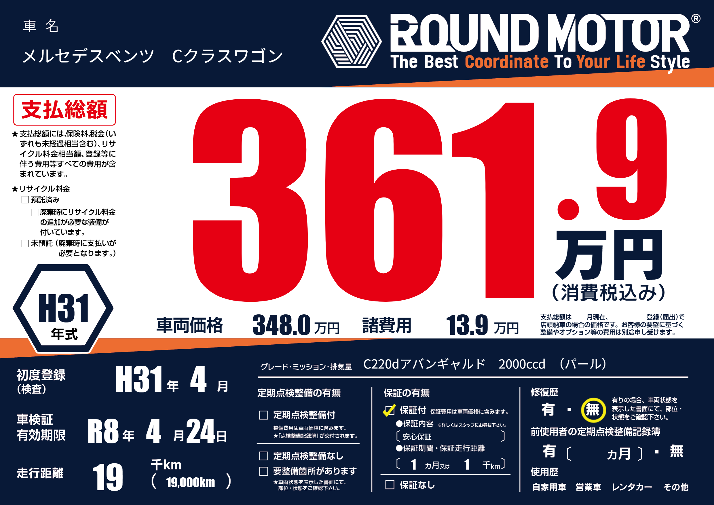 | 車名 | メルセデスベンツ Cクラスワゴン | グレード ミッション 排気量 |