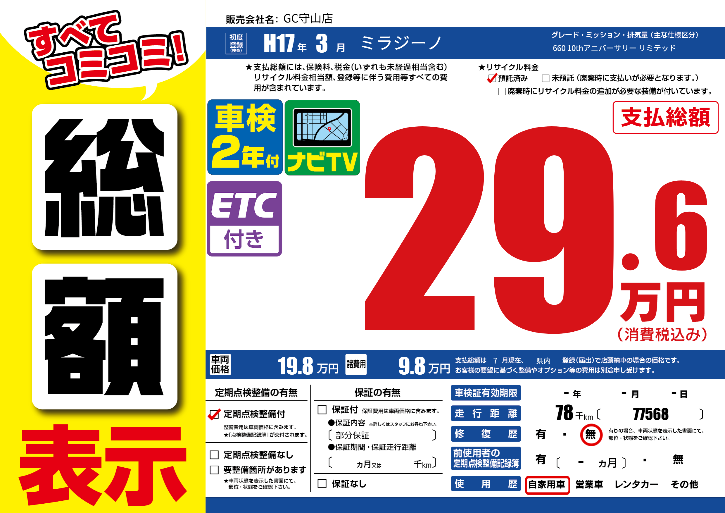 | 走行キロ | 7.8万km | 初年度登録 | H17年3月 |