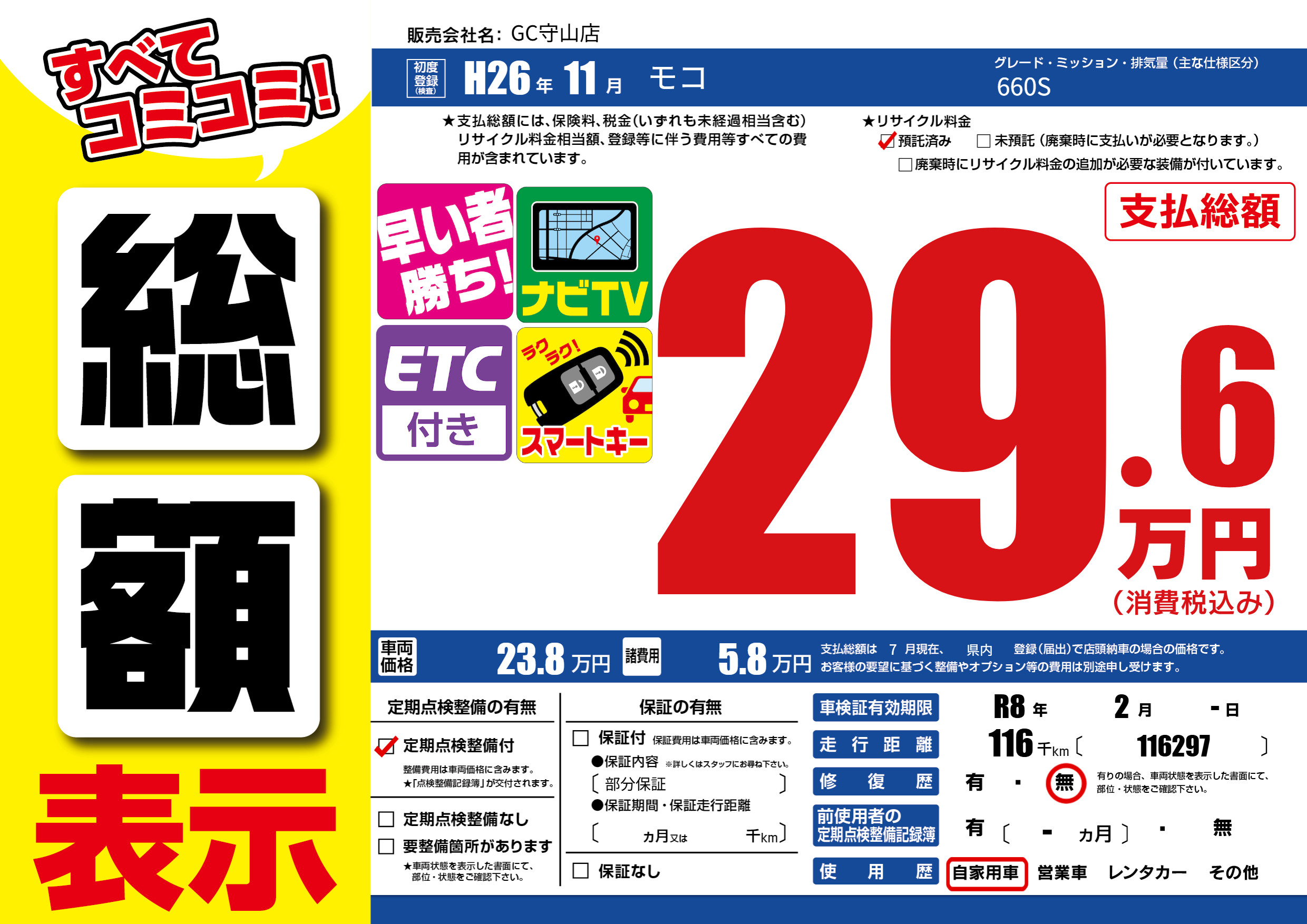 | 走行キロ | 11.6万km | 初年度登録 | H26年11月 |