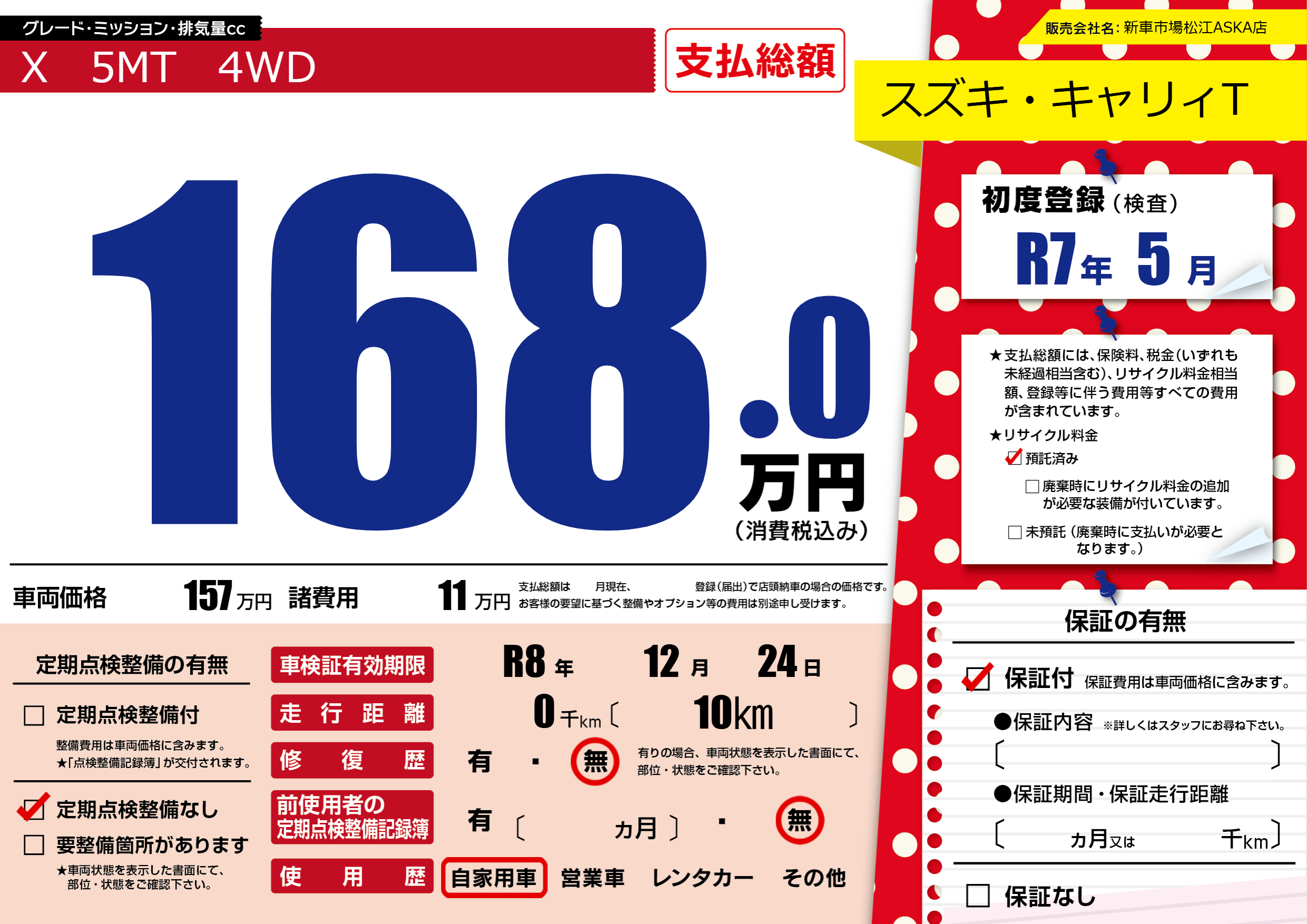 | 走行キロ | - | 初年度登録 | R7年5月 |