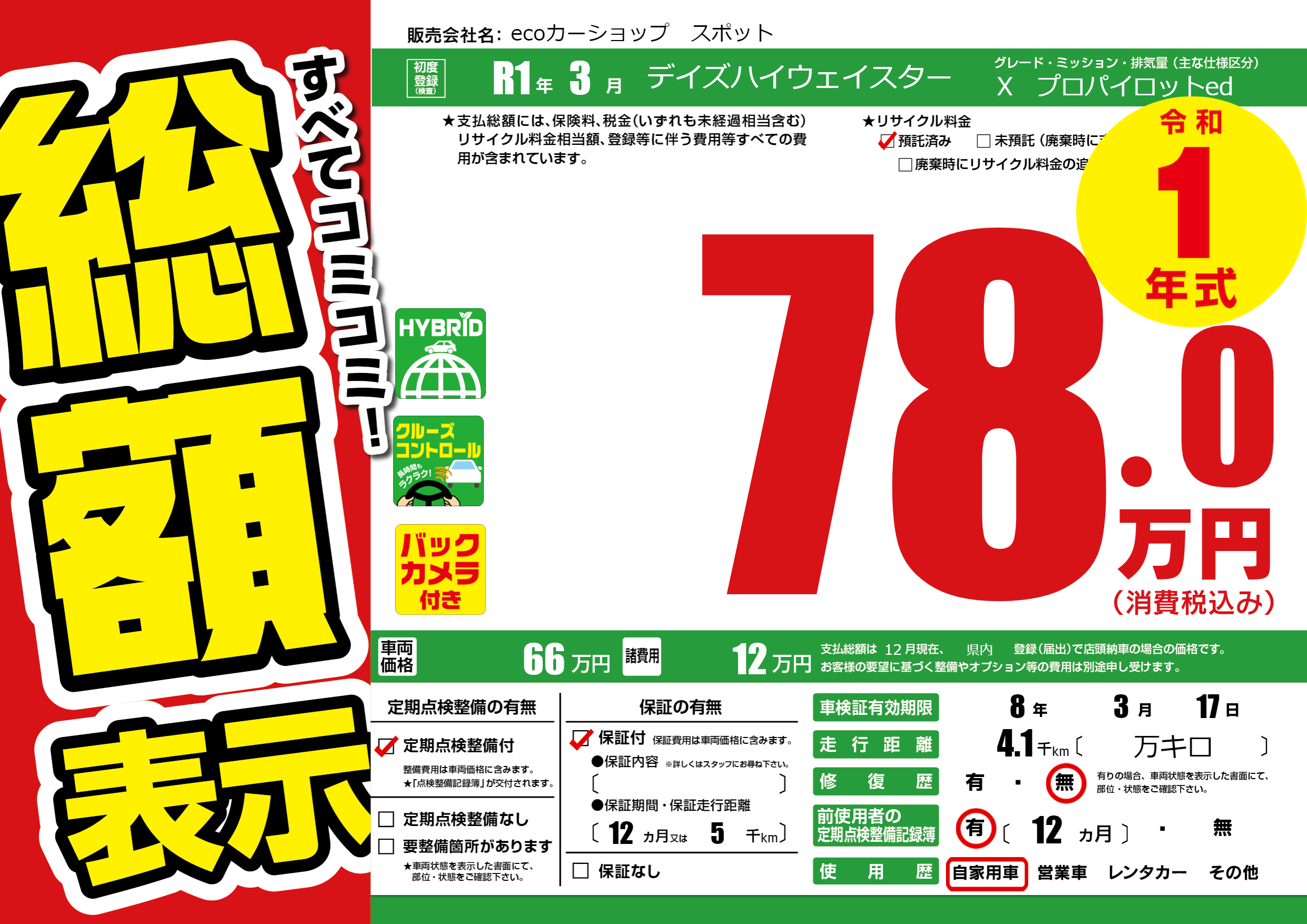 | 車名 | デイズハイウェイスター | グレード ミッション 排気量 |