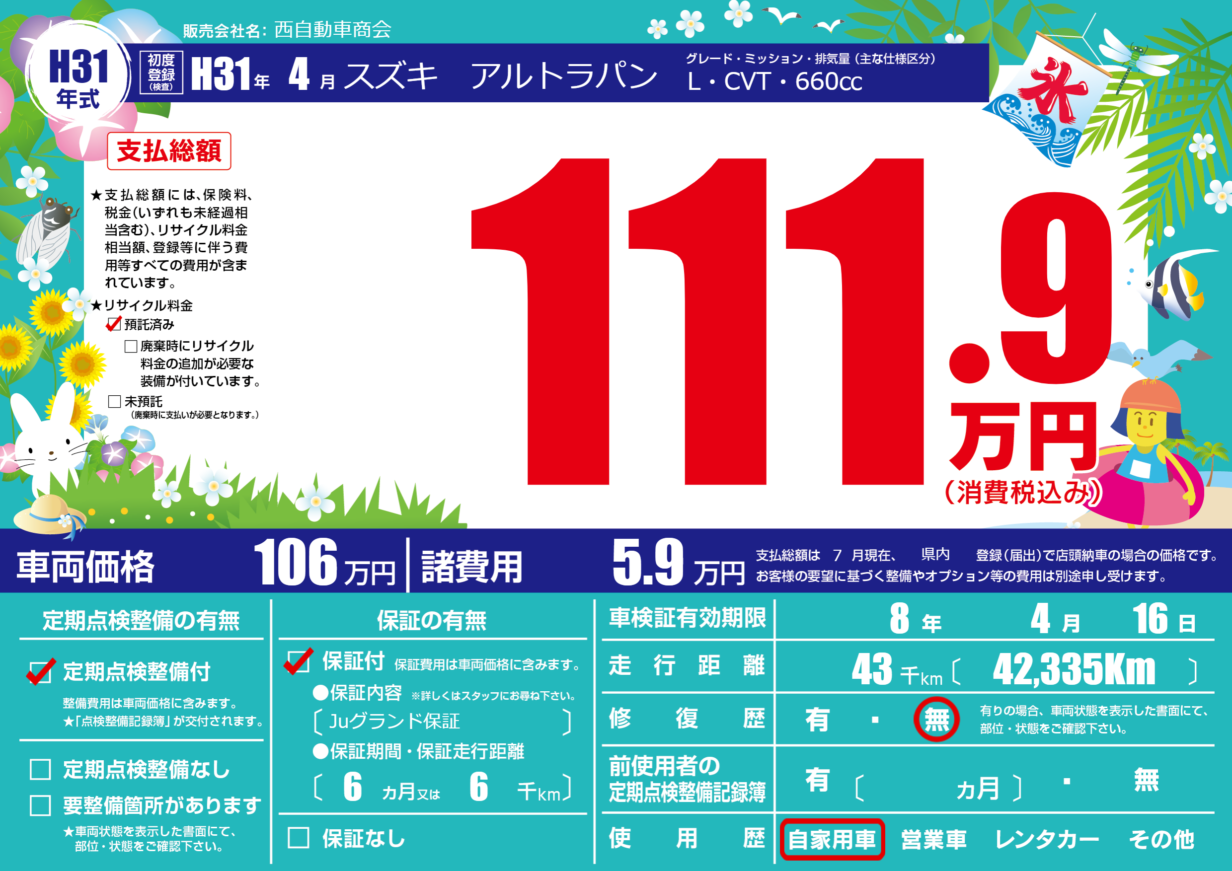 保証付き 保証内容(Juグランド保証) 6ヶ月または(6)千kmまで |