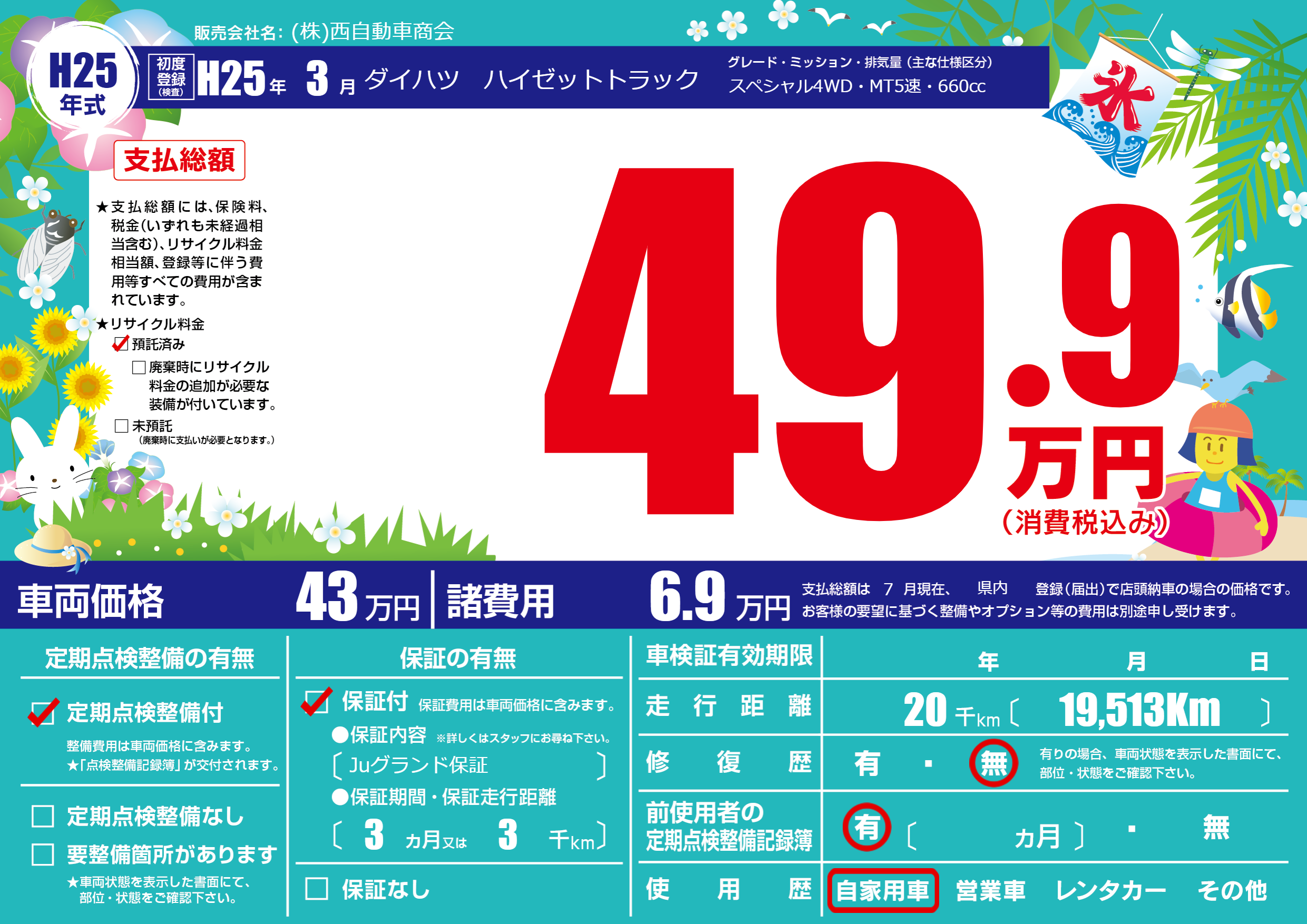 | 走行キロ | 2万km | 初年度登録 | H25年3月 |