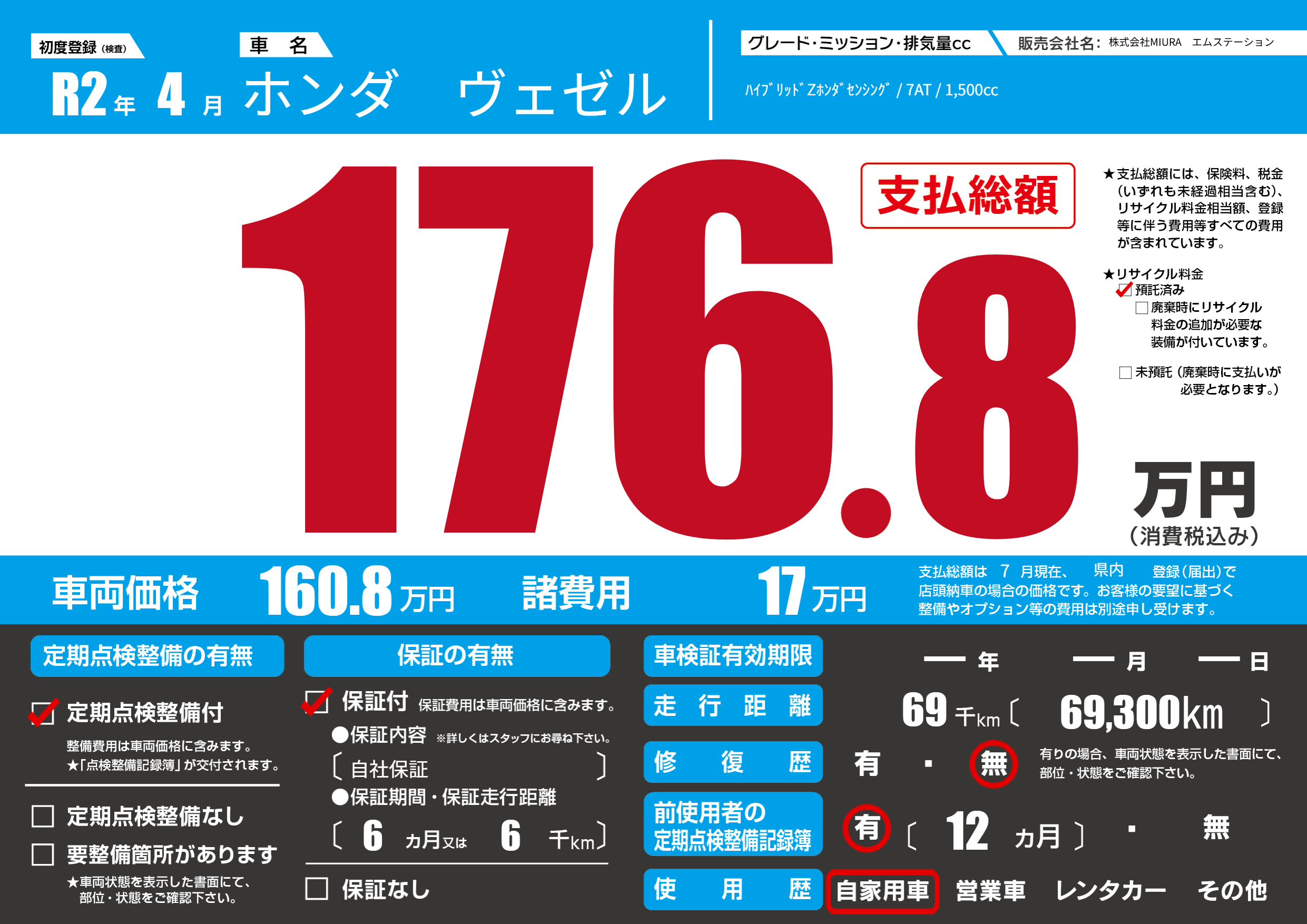 | 車名 | ホンダ ヴェゼル | グレード ミッション 排気量 |
