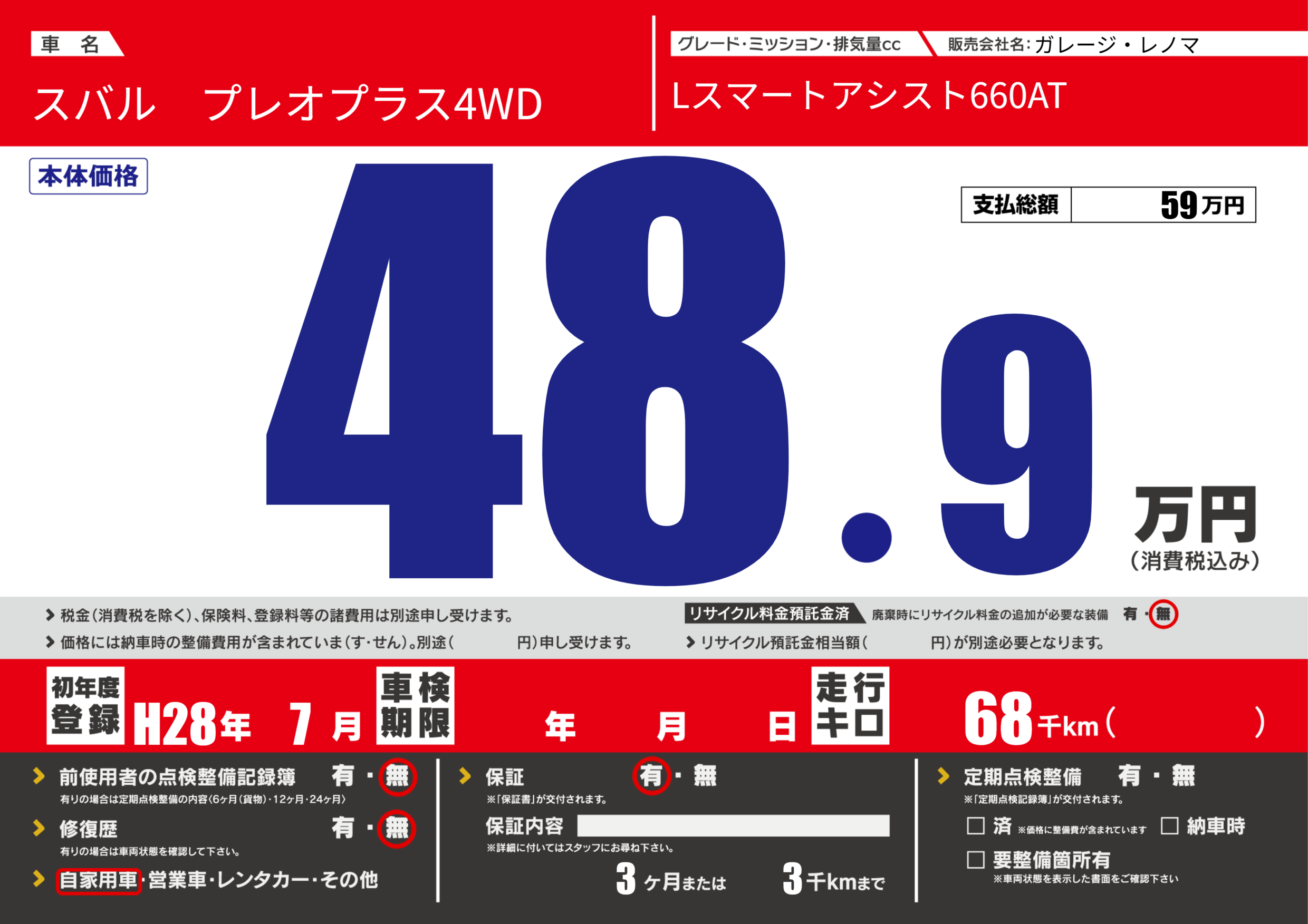 | 車名 | スバル プレオプラス4WD | グレード ミッション 排気量 |