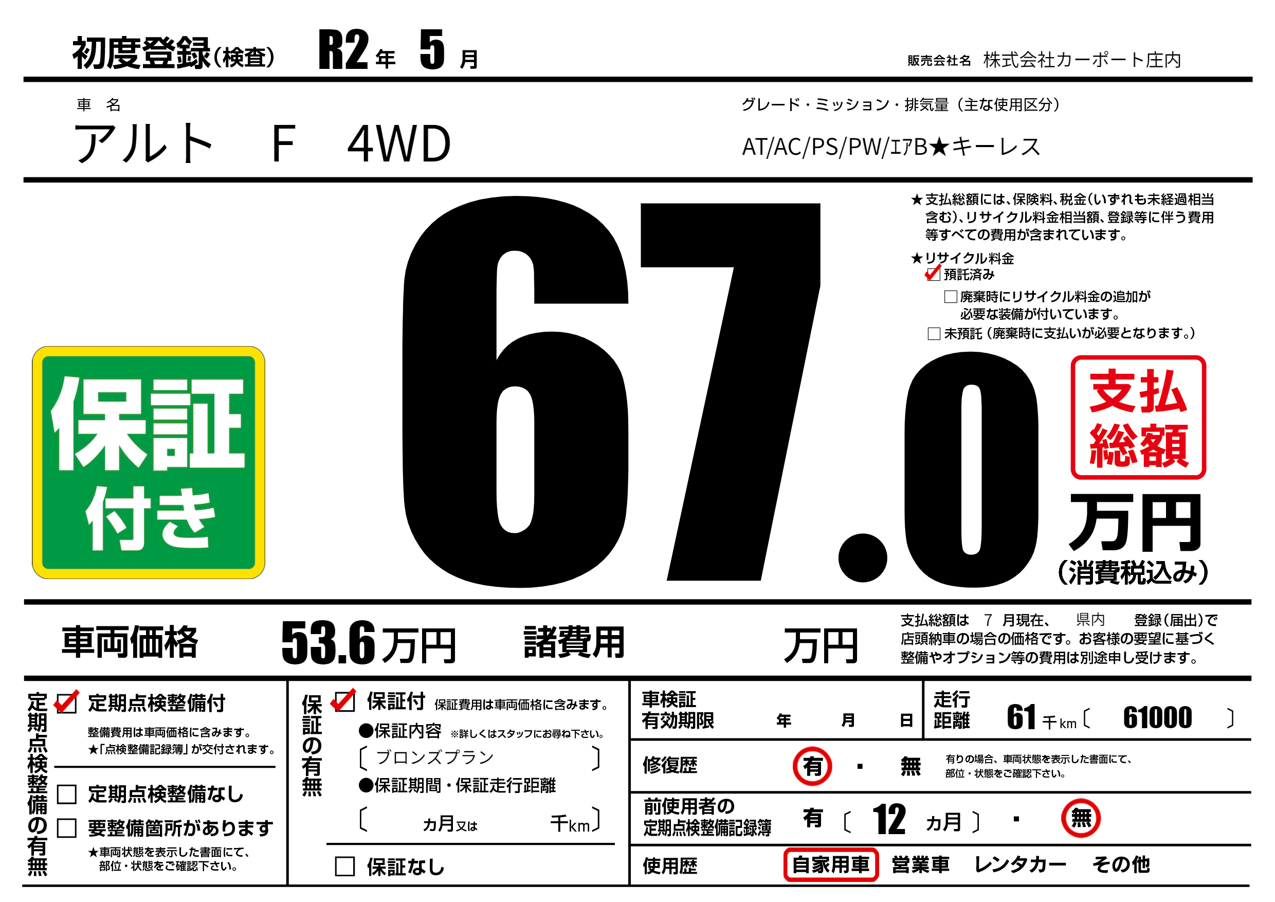 | 車名 | アルト F 4WD | グレード ミッション 排気量 |