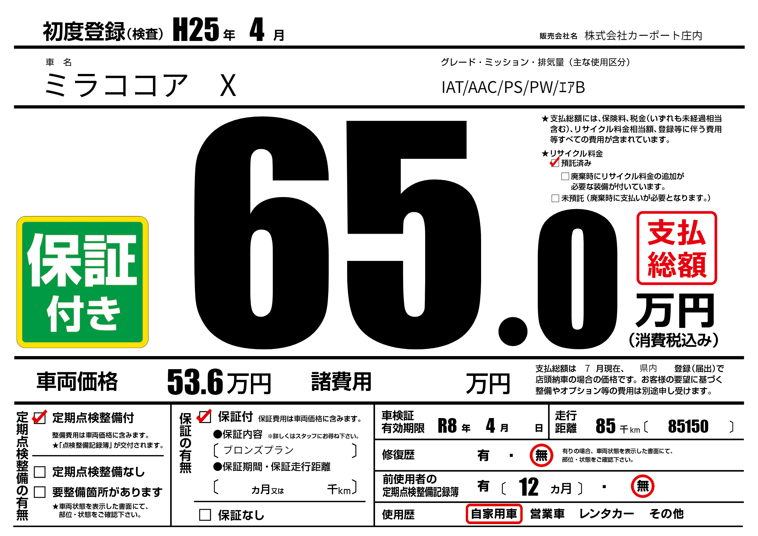 | 車名 | ミラココア X | グレード ミッション 排気量 |