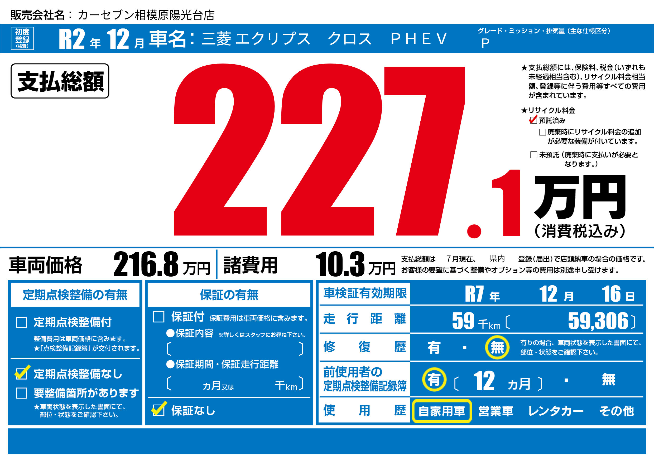 | 車名 | 三菱 エクリプス クロス PHEV | グレード ミッション 排気量 |