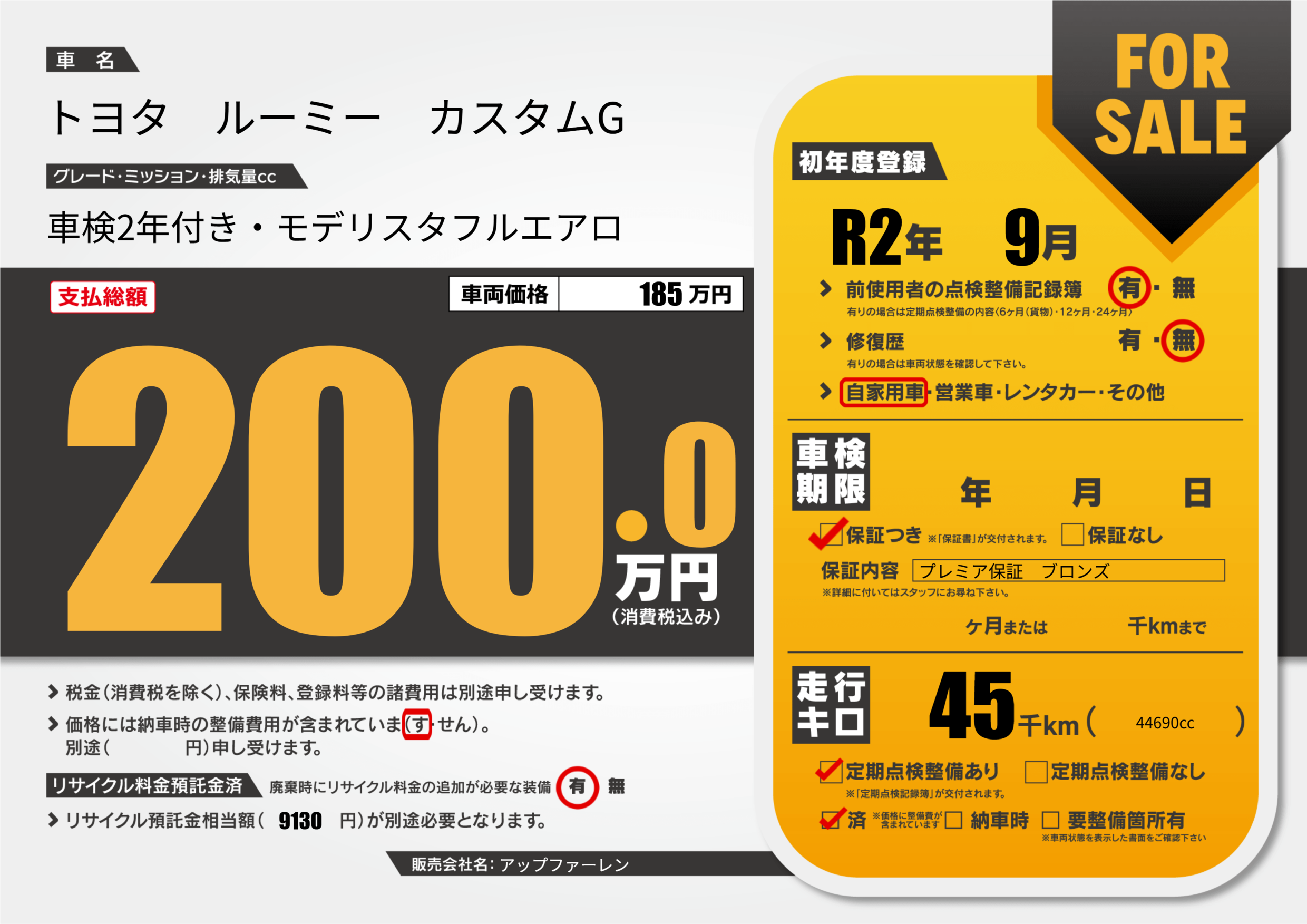 | 車名 | トヨタ ルーミー カスタムG | グレード ミッション 排気量 |