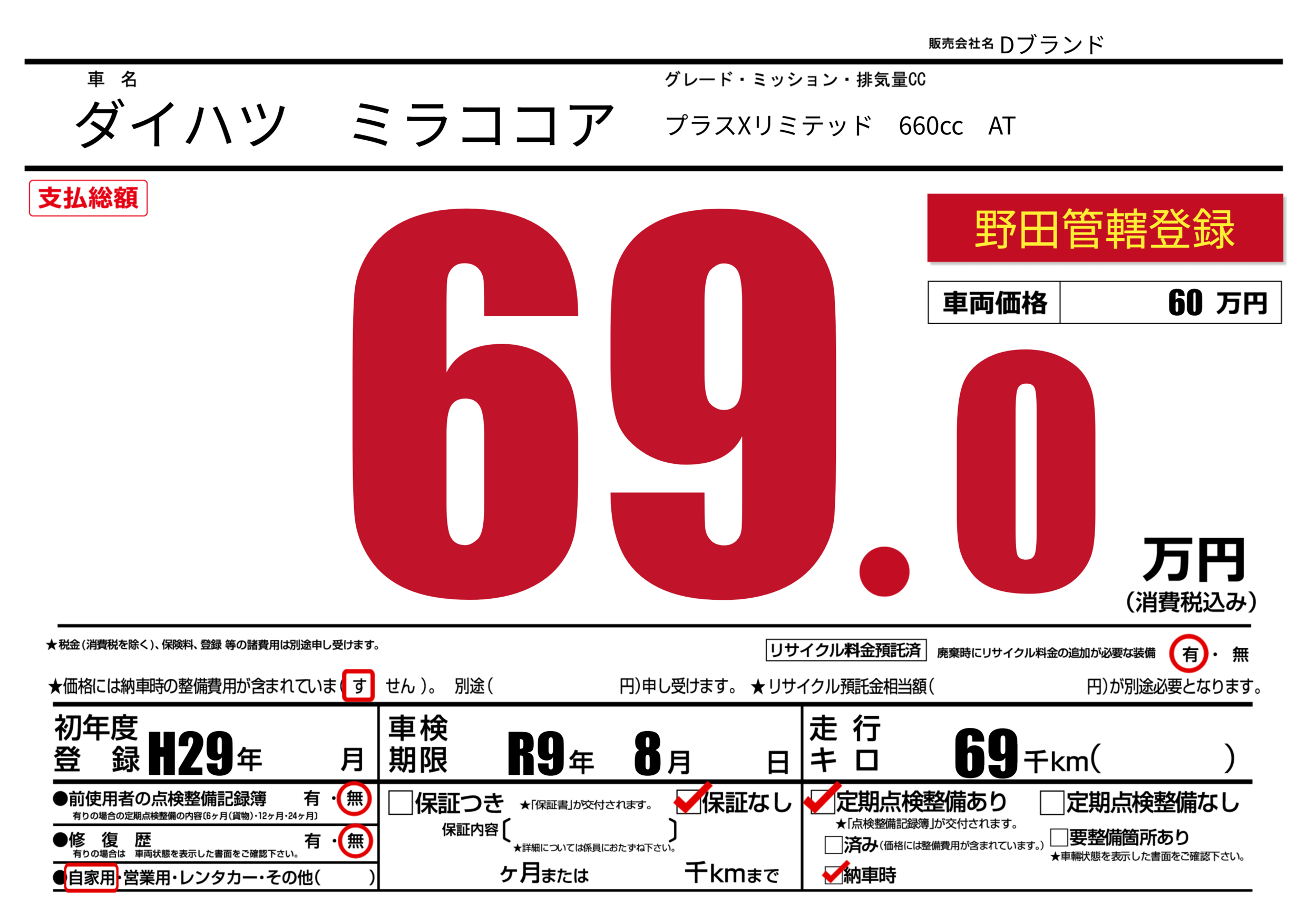 | 車名 | ダイハツ ミラココア | グレード ミッション 排気量 |