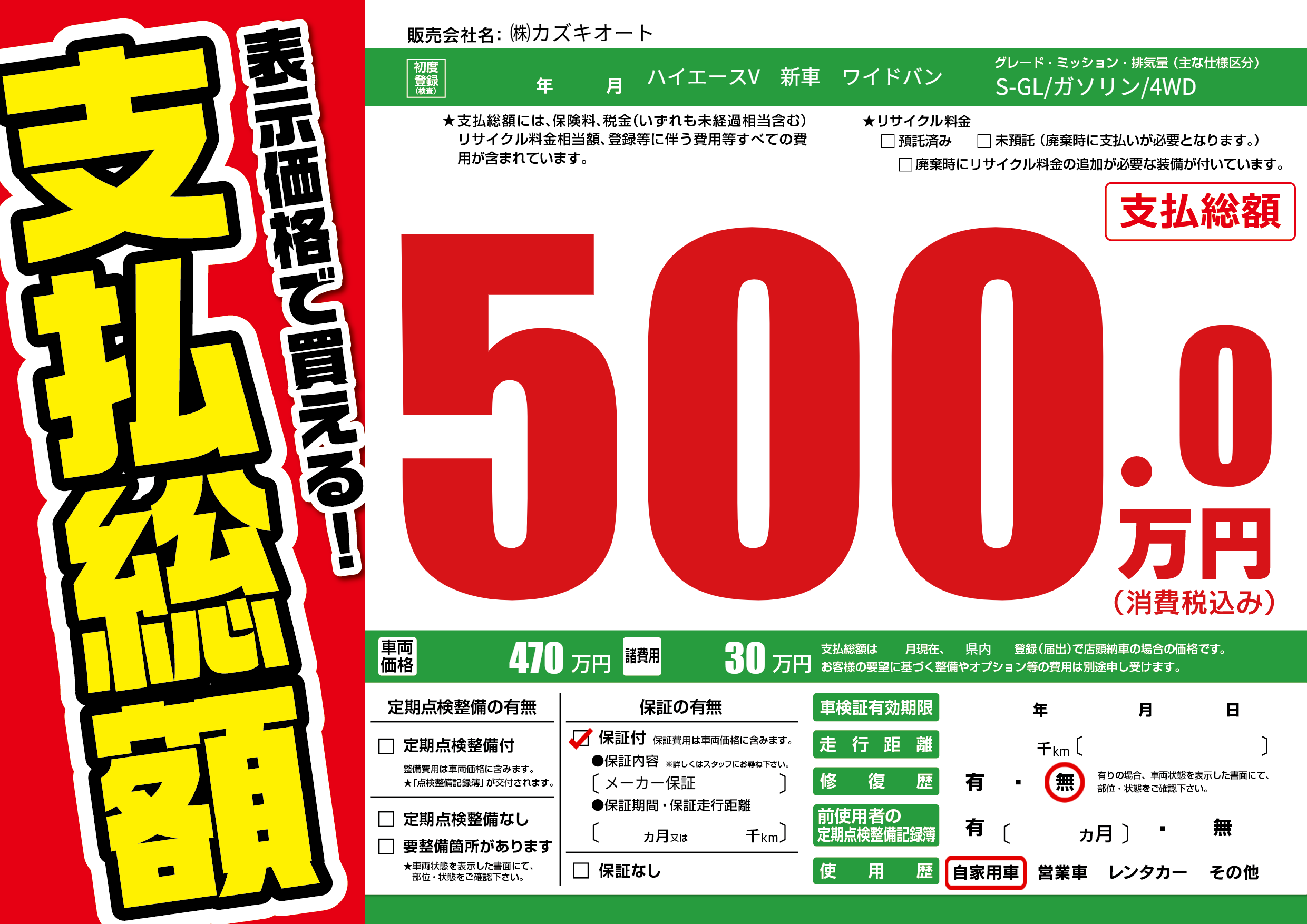 | 車名 | ハイエースV 新車 ワイドバン | グレード ミッション 排気量 |