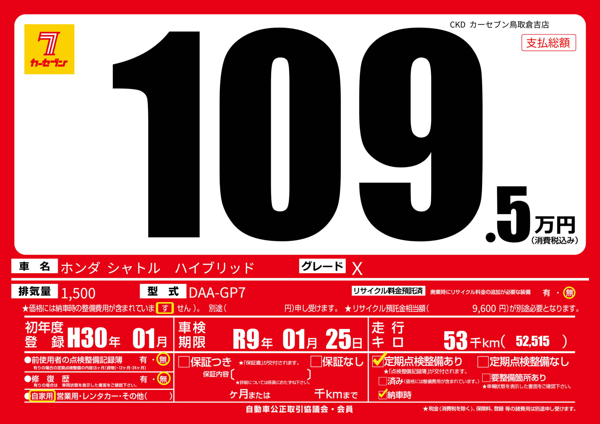 | 車名 | ホンダ シャトル ハイブリッド | グレード ミッション 排気量 |