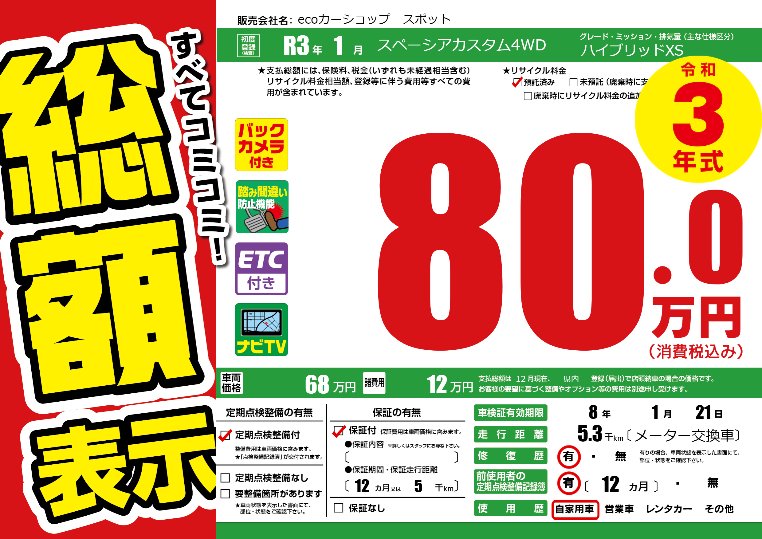 | 車名 | スペーシアカスタム4WD | グレード ミッション 排気量 |