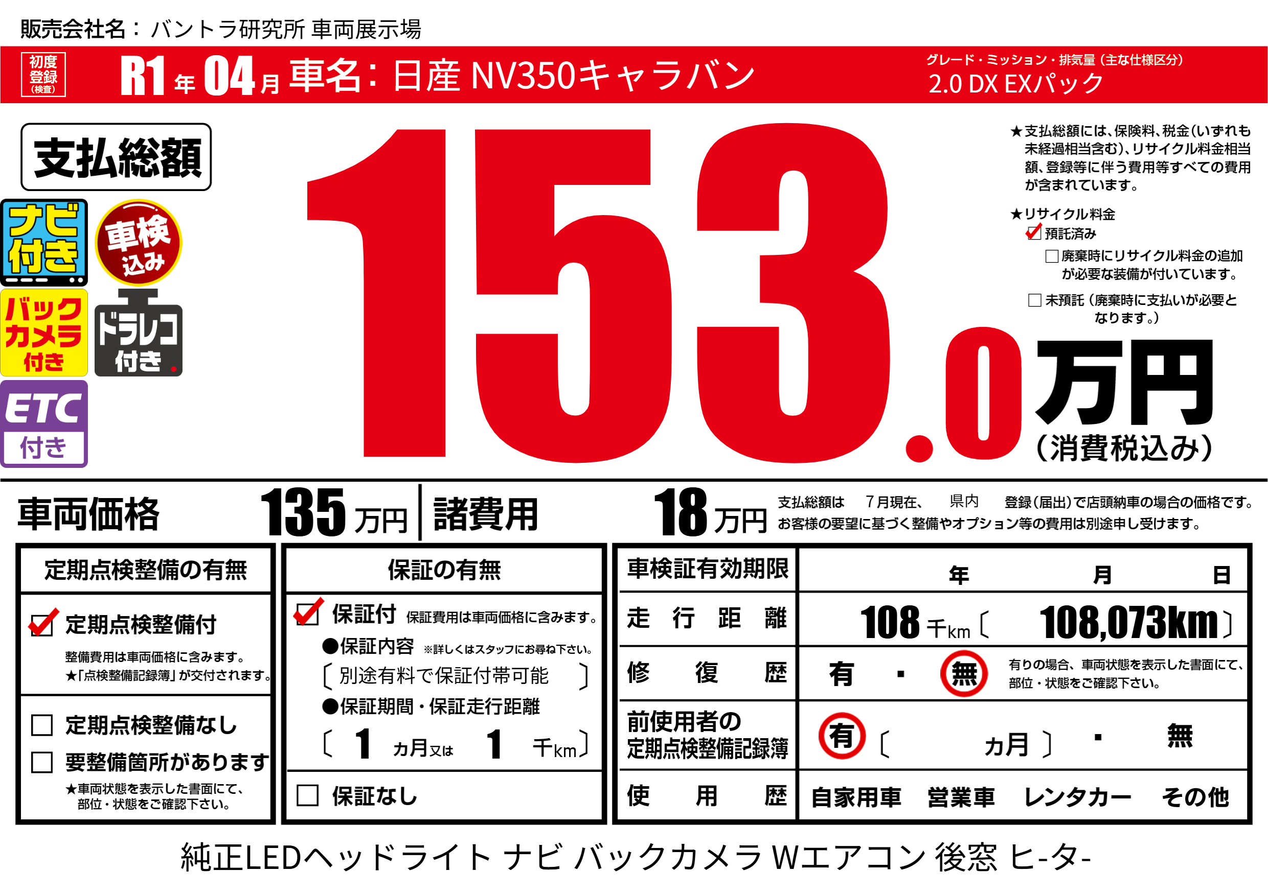 | 車名 | 日産 NV350キャラバン | グレード ミッション 排気量 |