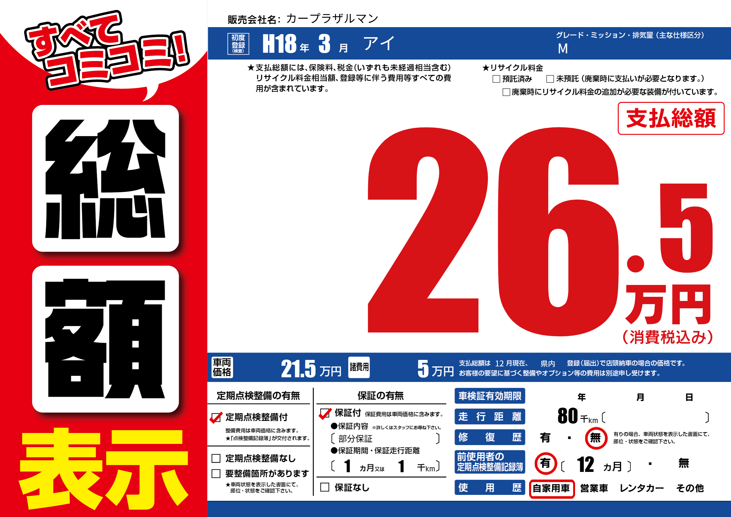 | 走行キロ | 8万km | 初年度登録 | H18年3月 |