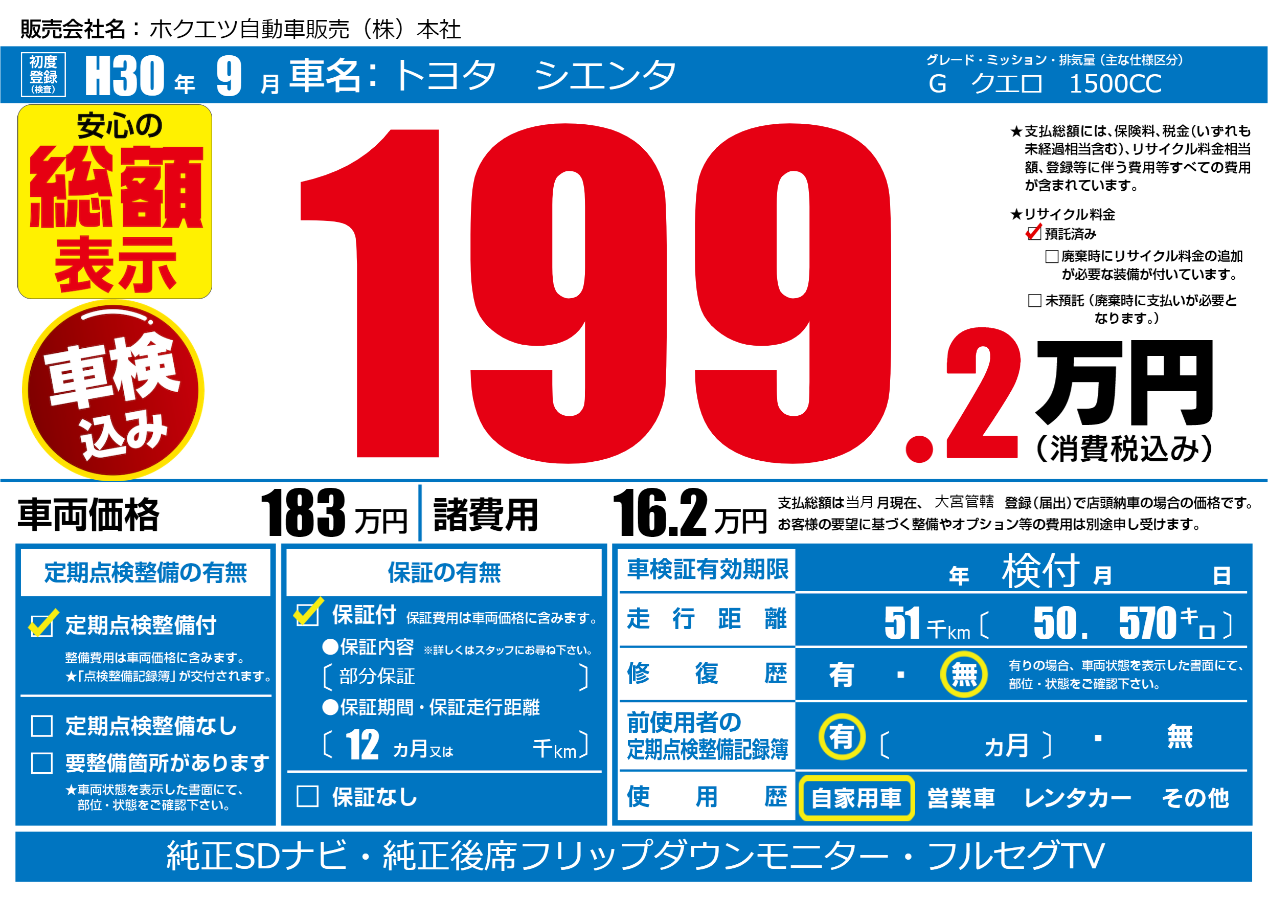 | 車名 | トヨタ シエンタ | グレード ミッション 排気量 |