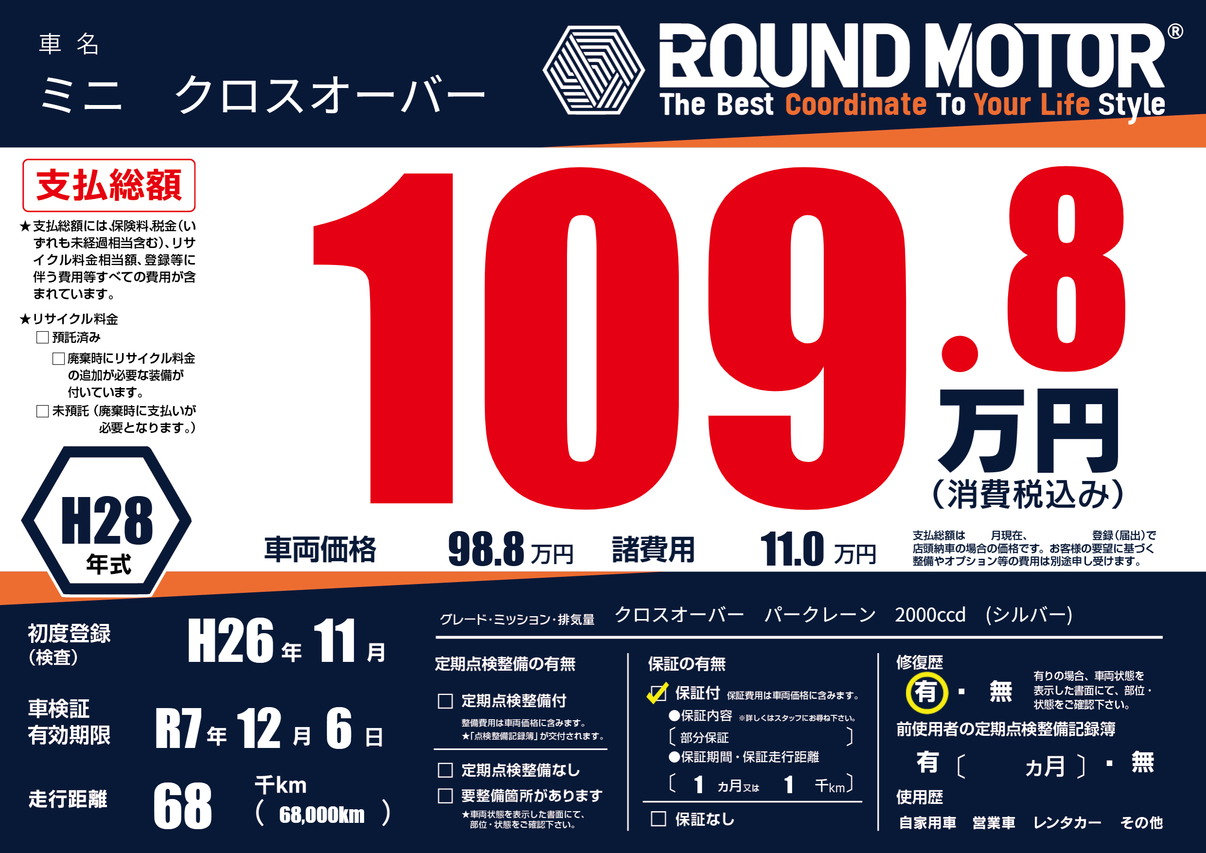 | 車名 | ミニ クロスオーバー | グレード ミッション 排気量 |