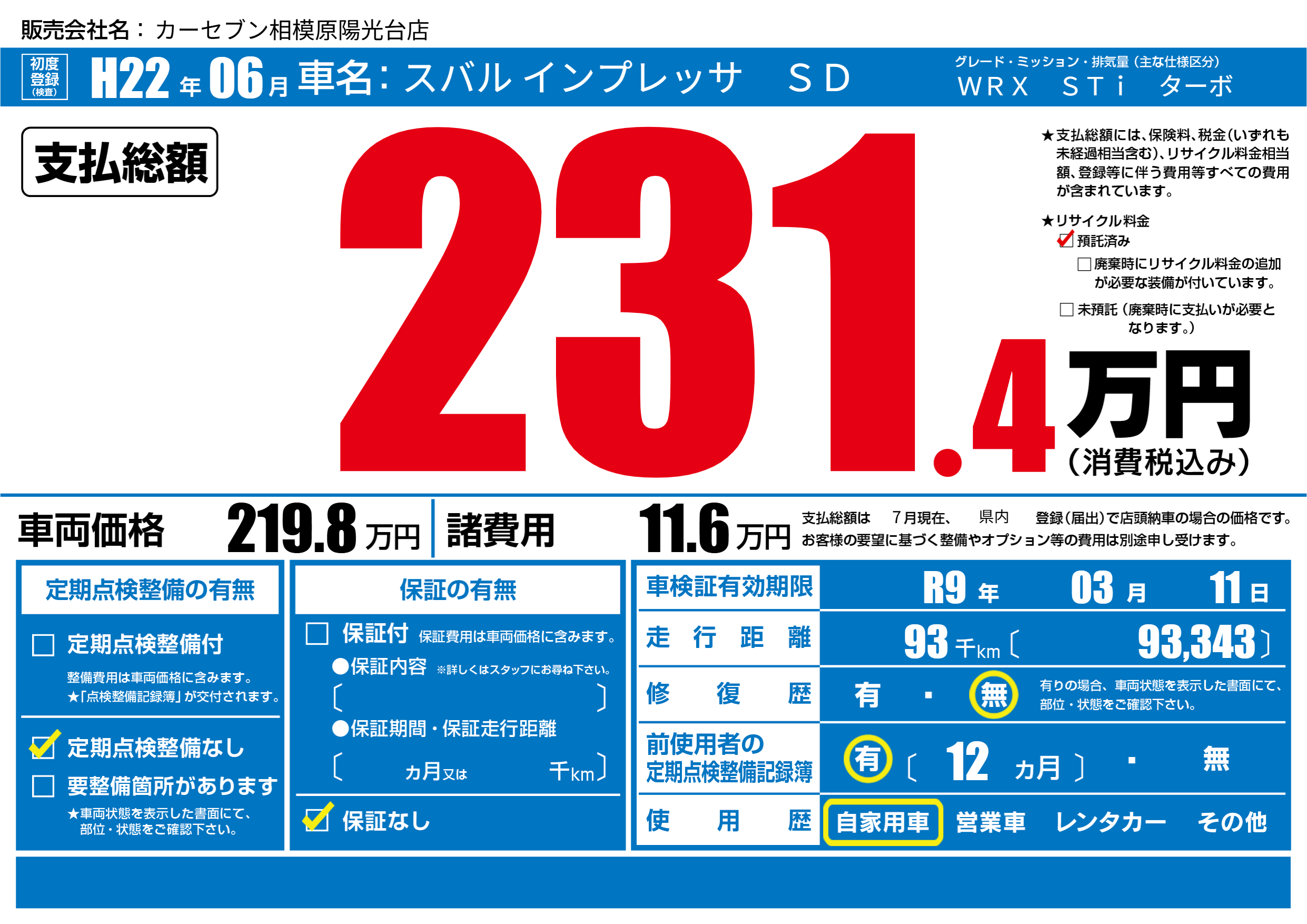 | 車検制限 | R9年 03月 11日 | ||