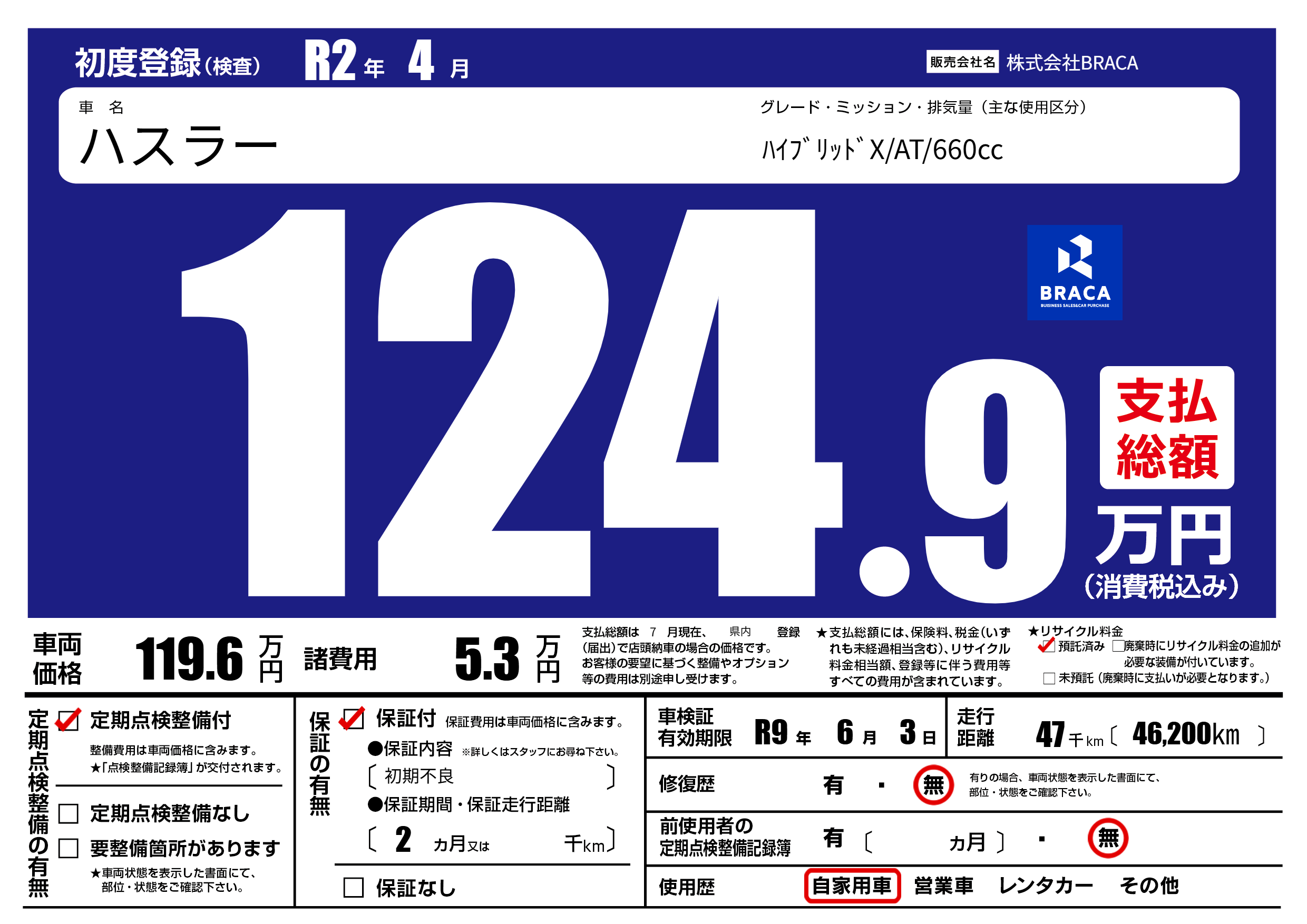 | 車名 | ハスラー | グレード ミッション 排気量 |