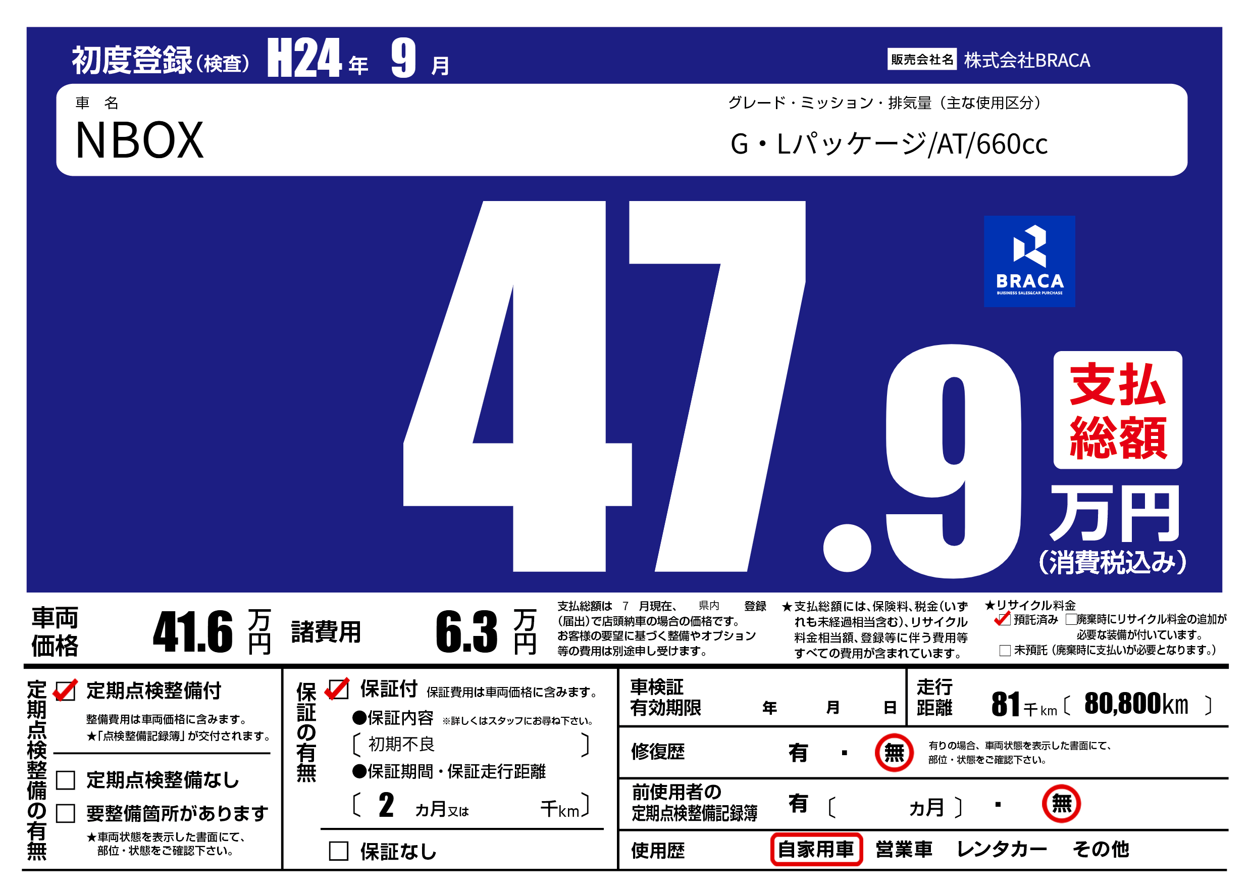 | 走行キロ | 8.1万km | 初年度登録 | H24年9月 |