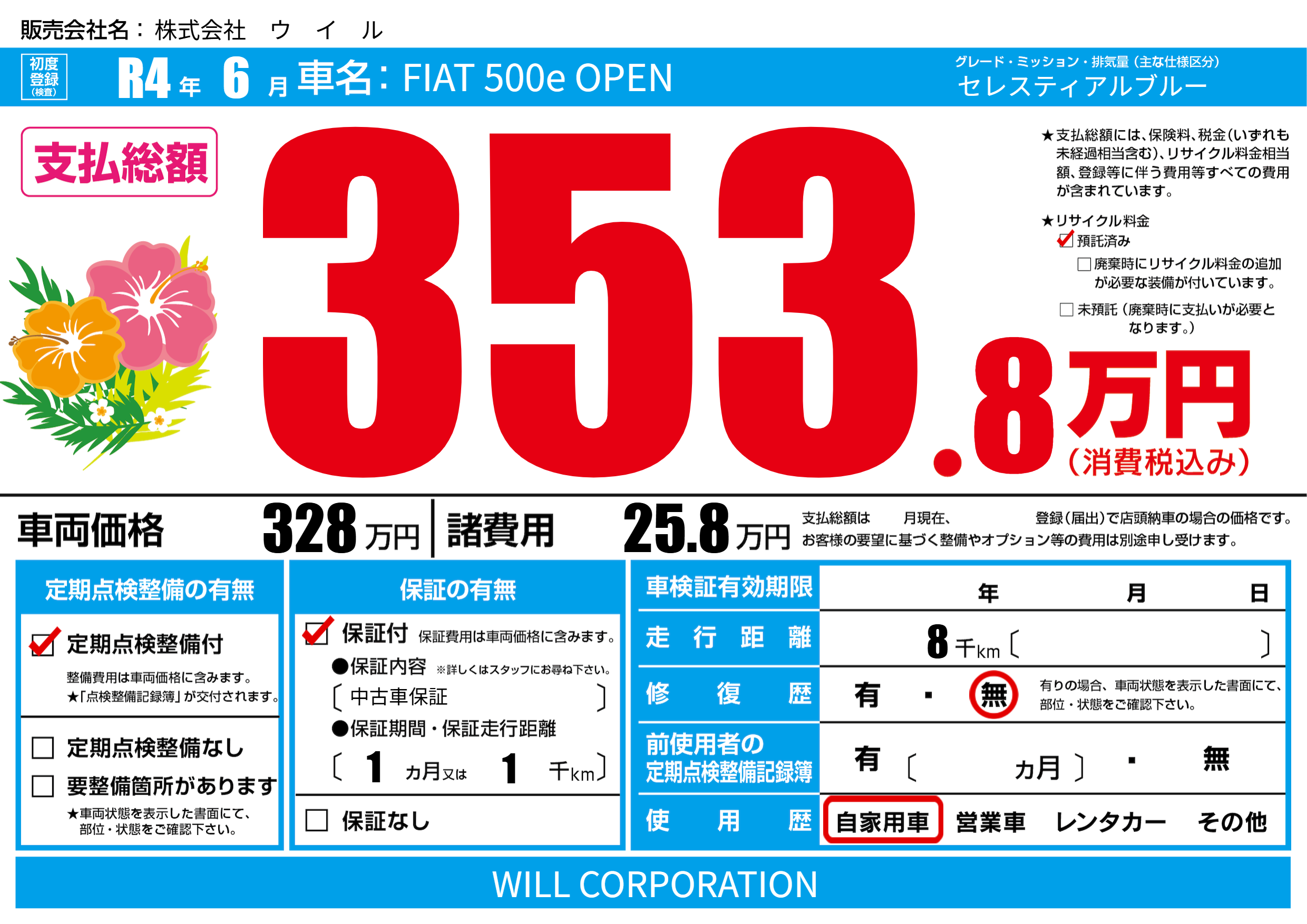 | 車名 | FIAT 500e OPEN | グレード ミッション 排気量 |