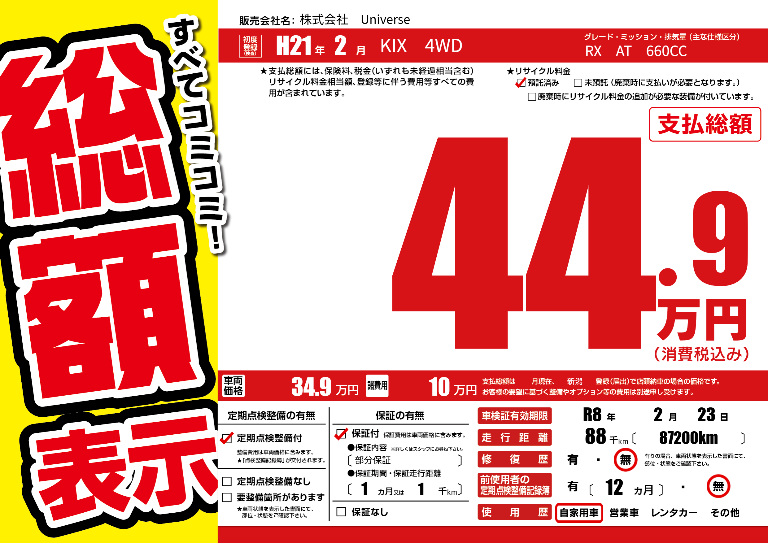| 車名 | KIX 4WD | グレード ミッション 排気量 |