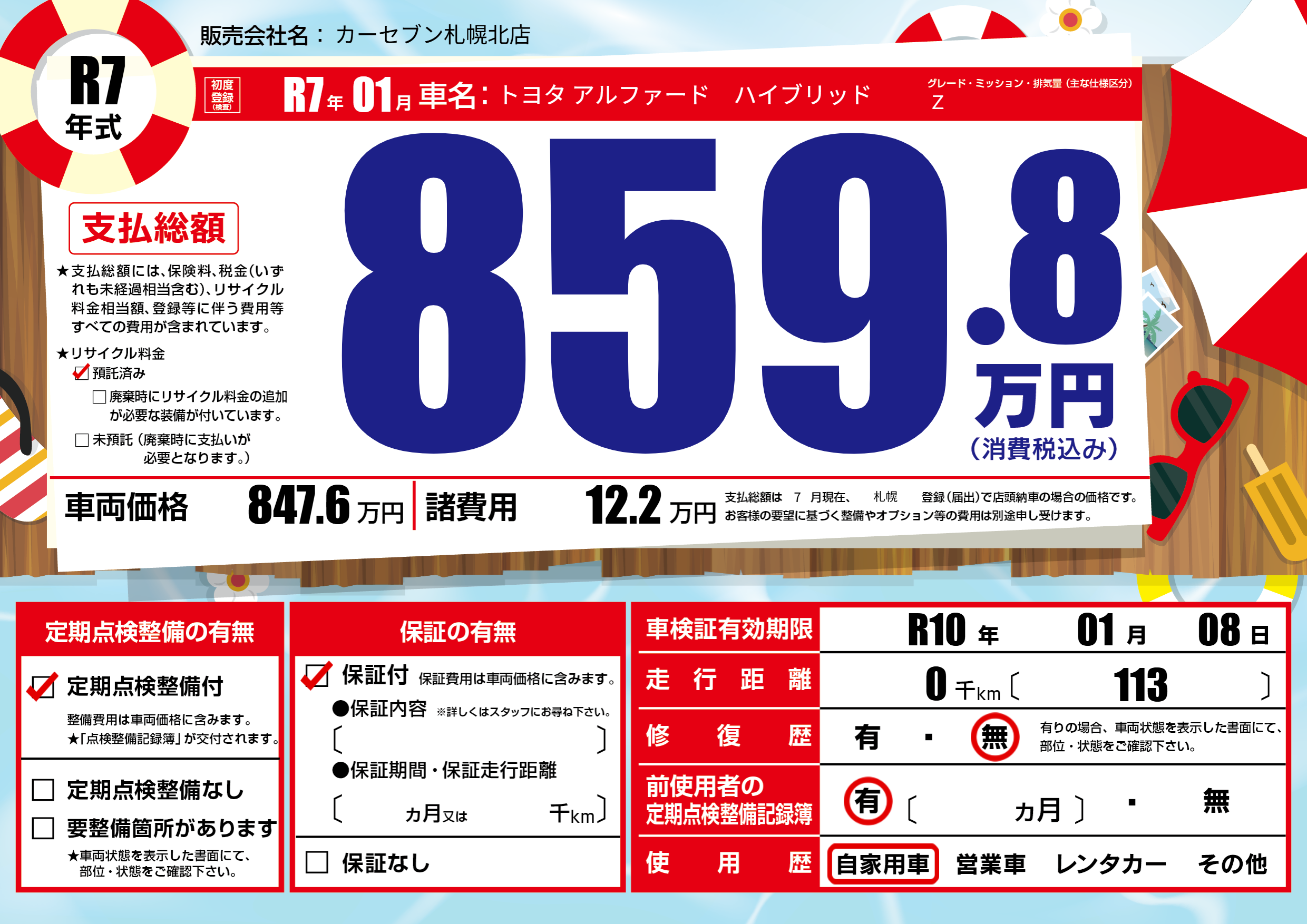 | 走行キロ | - | 初年度登録 | R7年01月 |