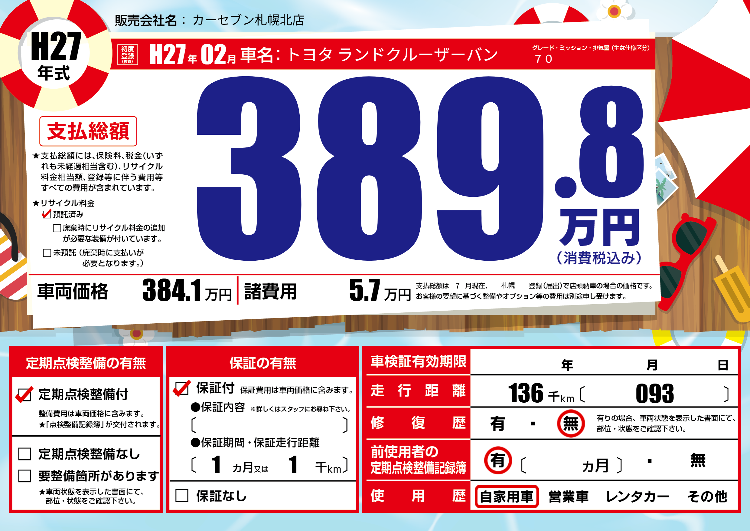 | 走行キロ | 13.6万km | 初年度登録 | H27年02月 |