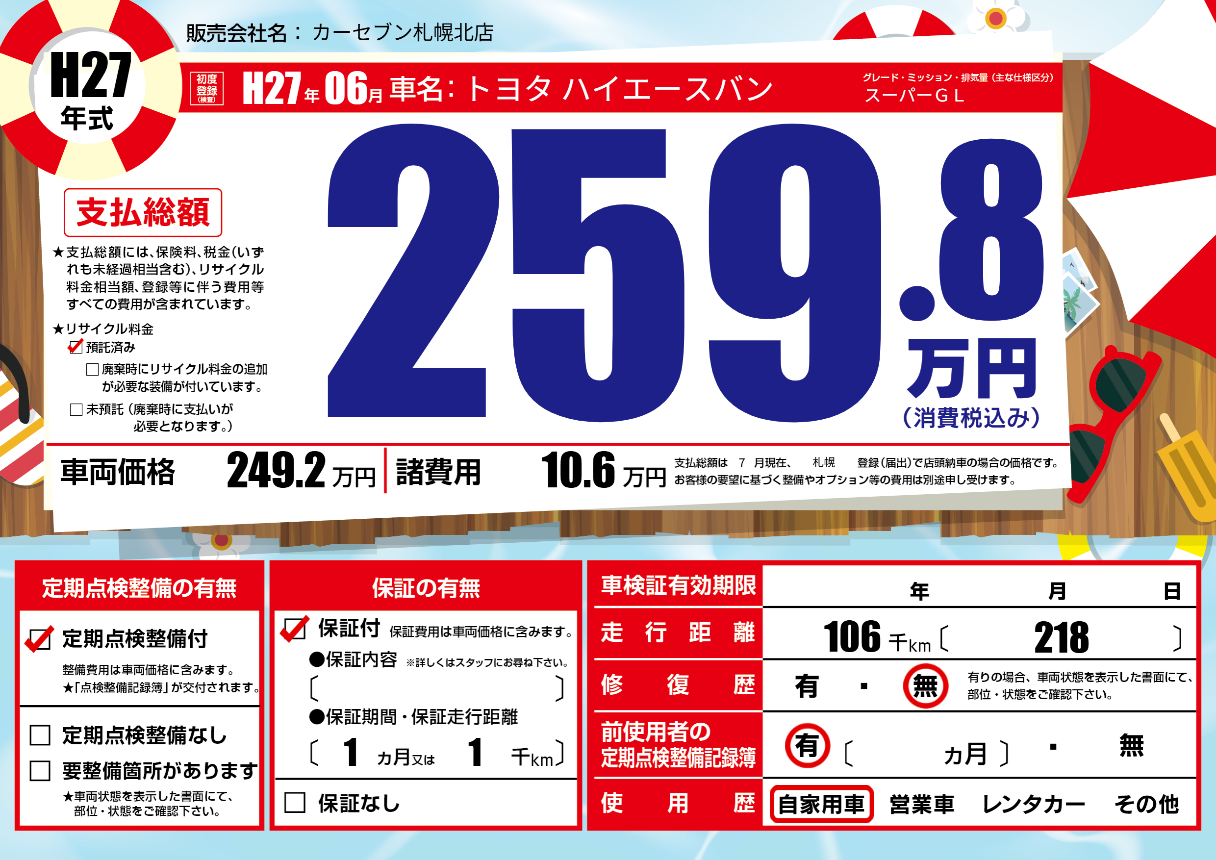 | 走行キロ | 10.6万km | 初年度登録 | H27年06月 |