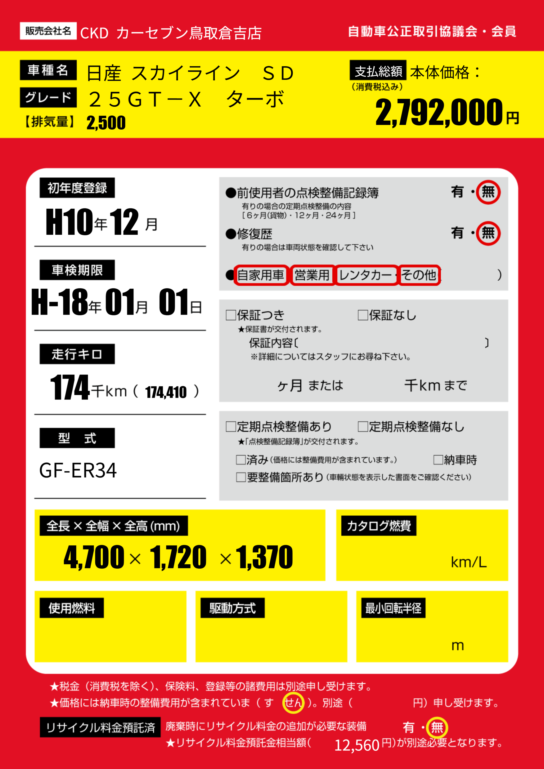 | 走行キロ | 17.4万km | 初年度登録 | H10年12月 |