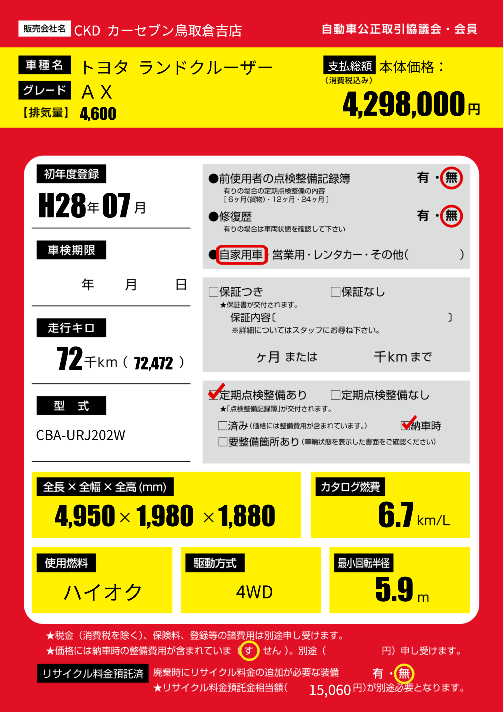 | 車名 | トヨタ ランドクルーザー | グレード ミッション 排気量 |