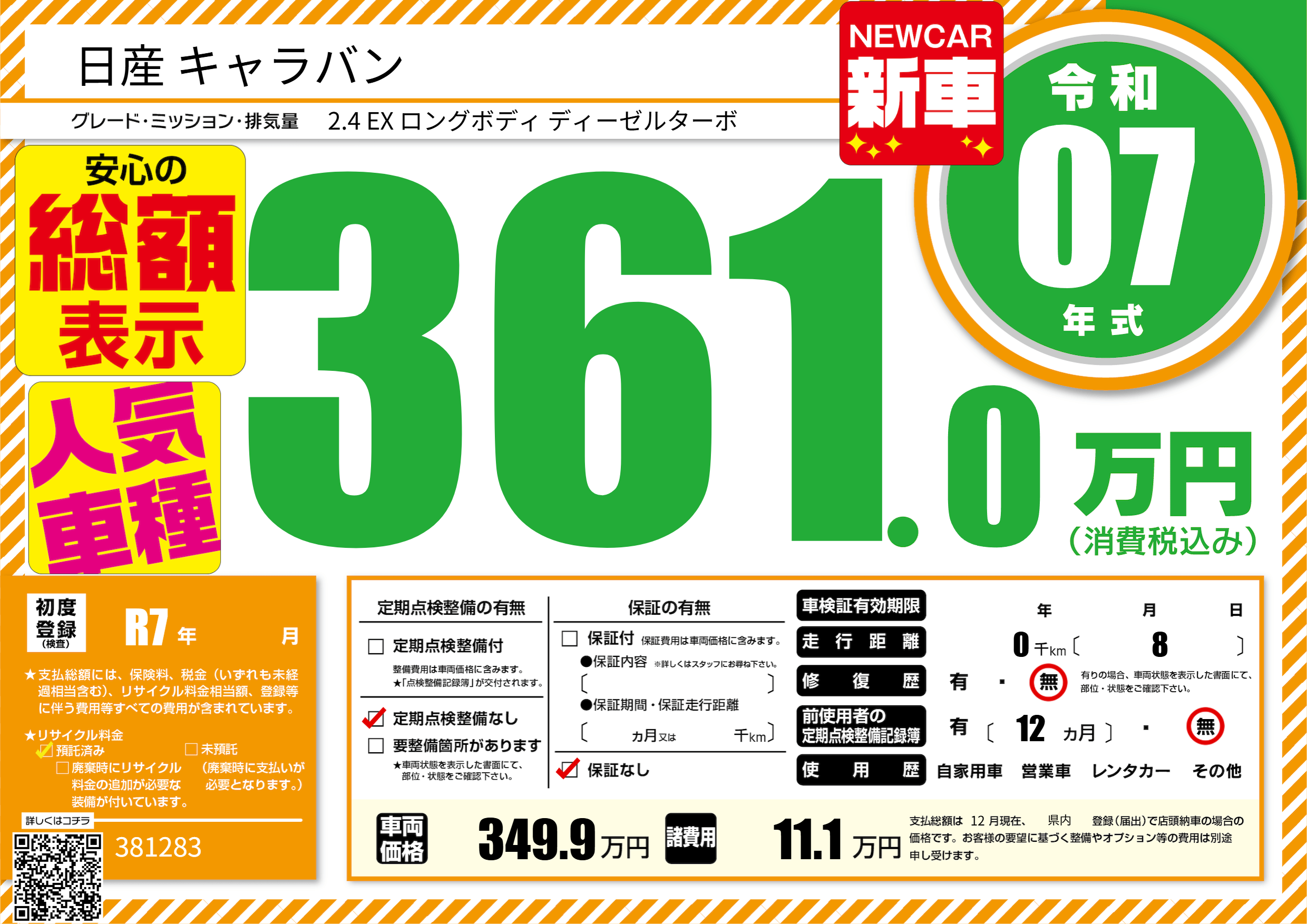 | 走行キロ | - | 初年度登録 | R7年---月 |