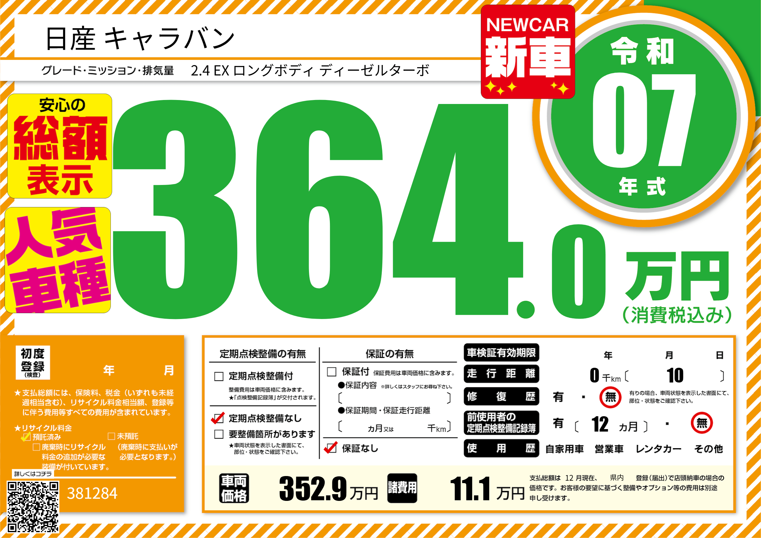 | 車名 | 日産 キャラバン | グレード ミッション 排気量 |