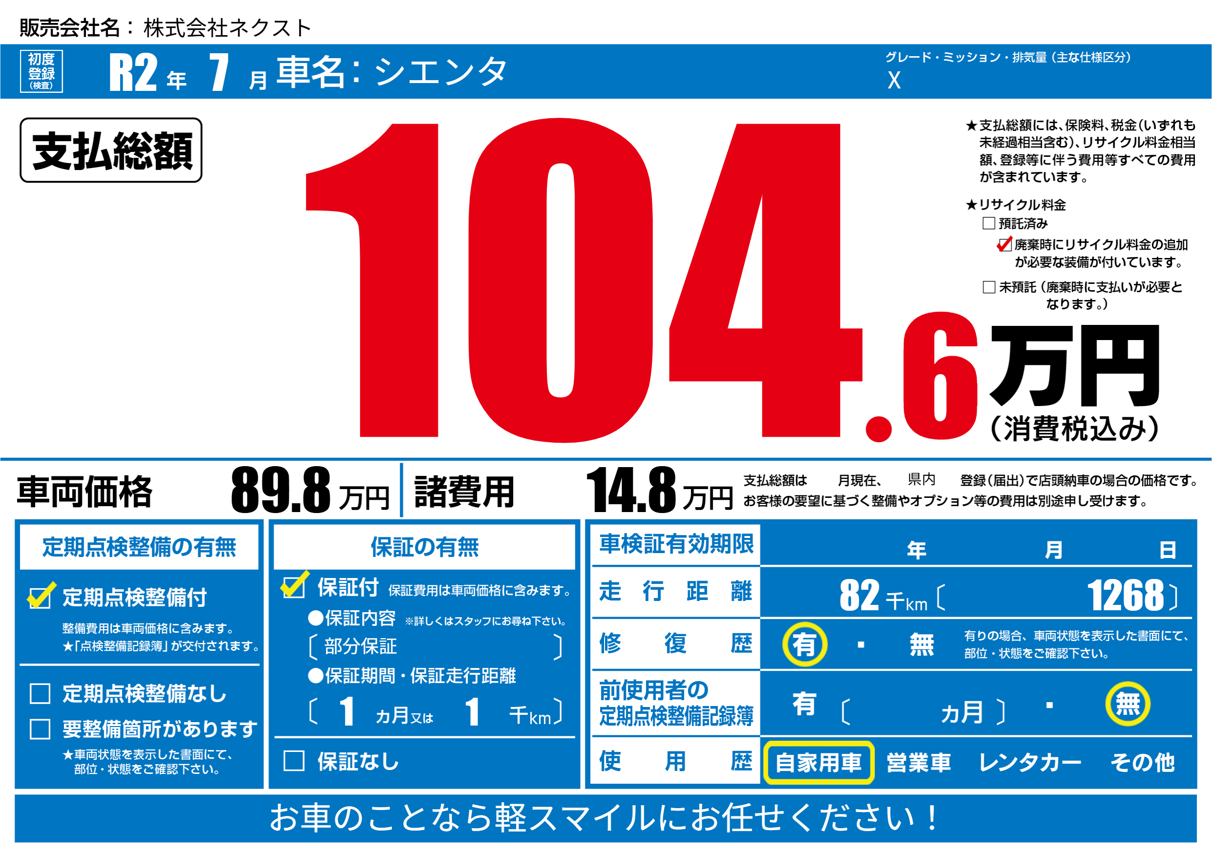| 車名 | シエンタ | グレード ミッション 排気量 |