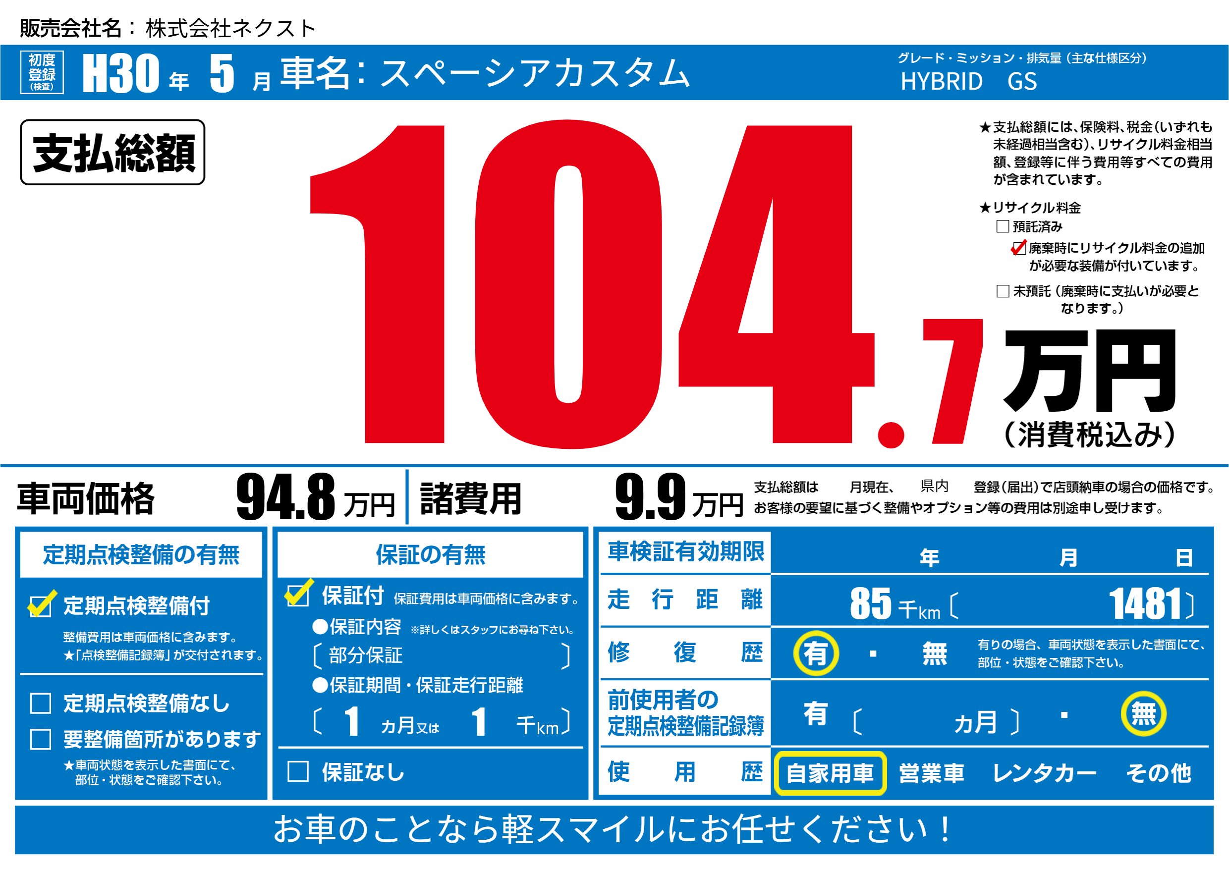 | 車名 | スペーシアカスタム | グレード ミッション 排気量 |