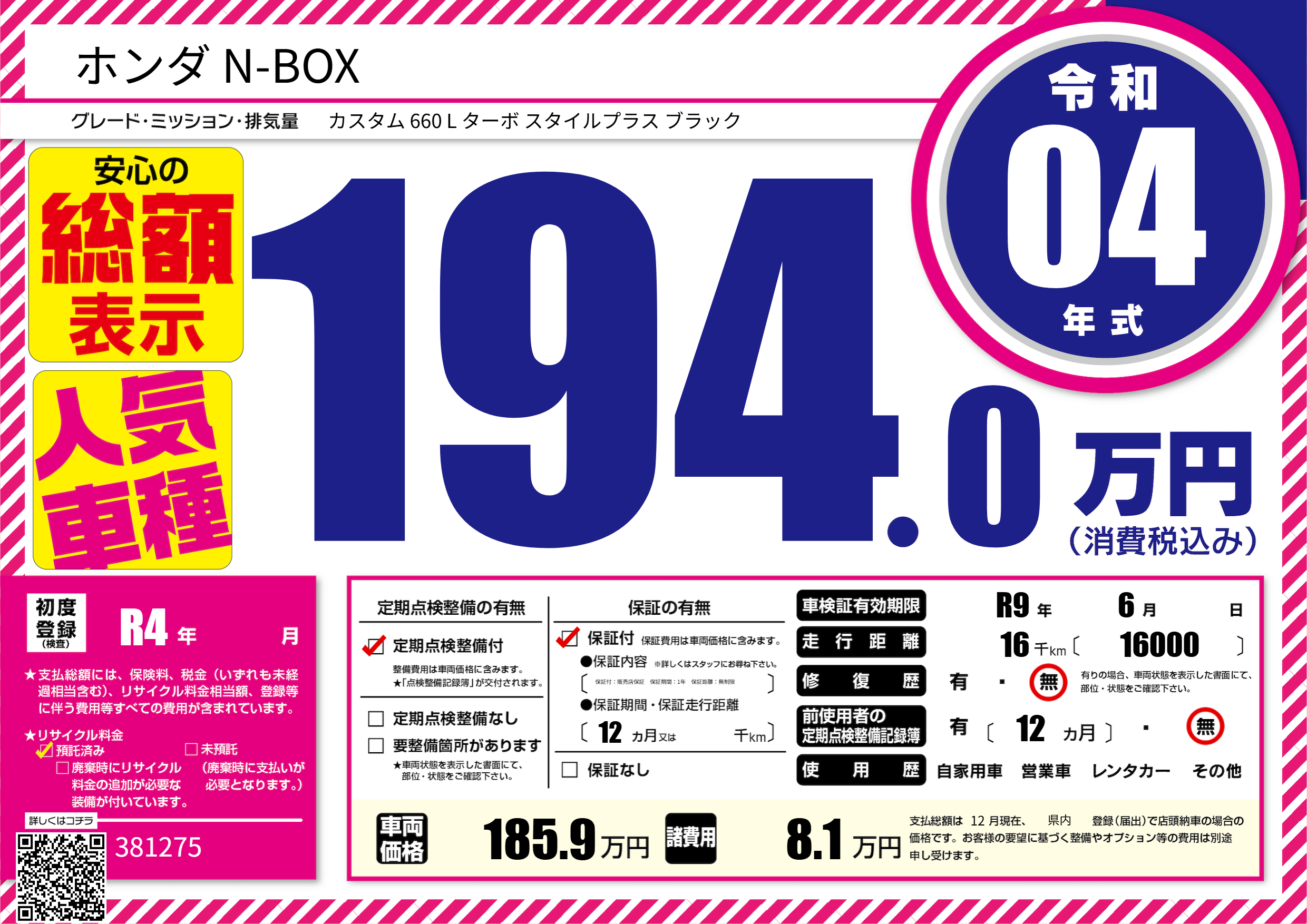 | 車名 | ホンダ N-BOX | グレード ミッション 排気量 |