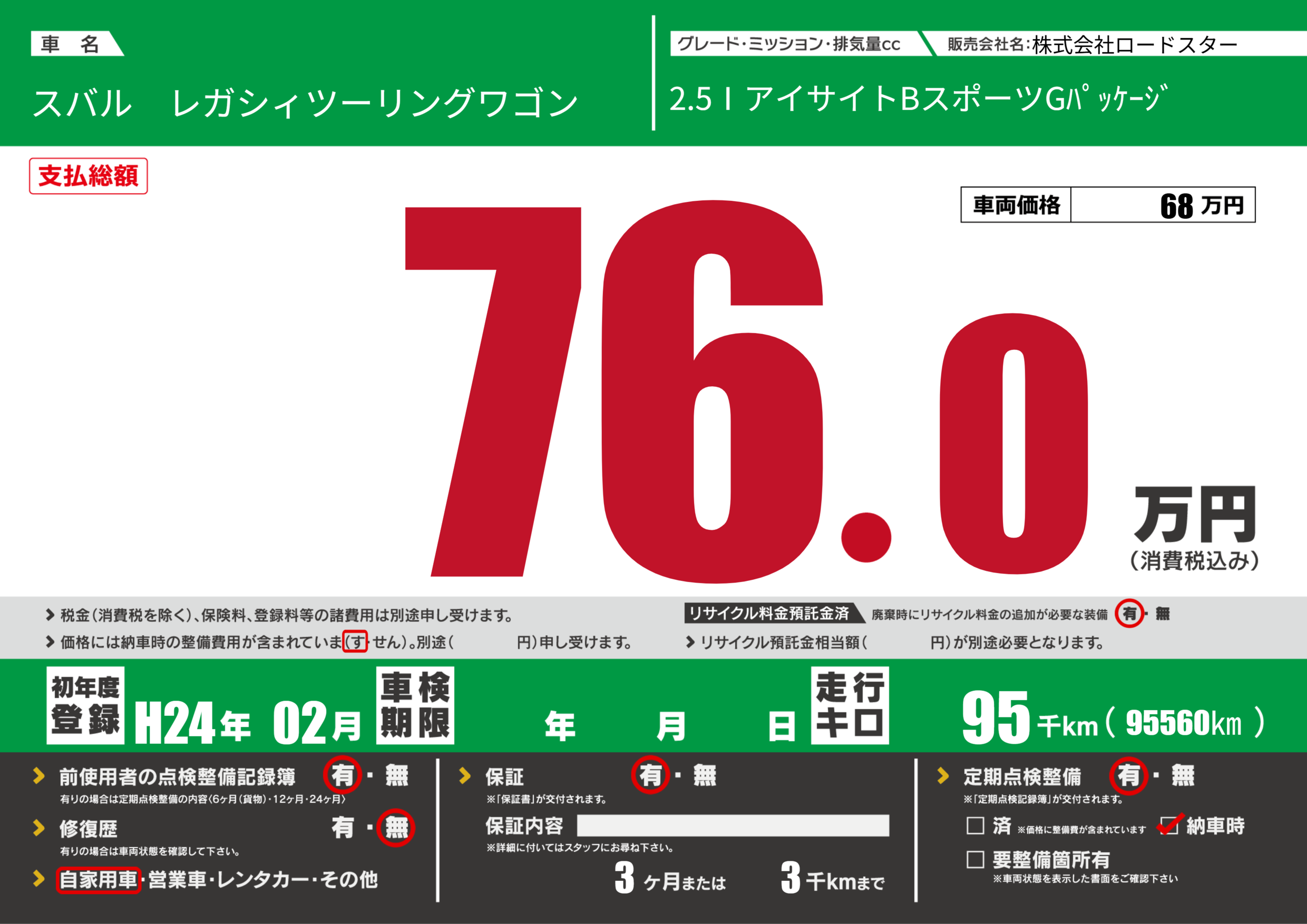 | 走行キロ | 9.5万km | 初年度登録 | H24年02月 |