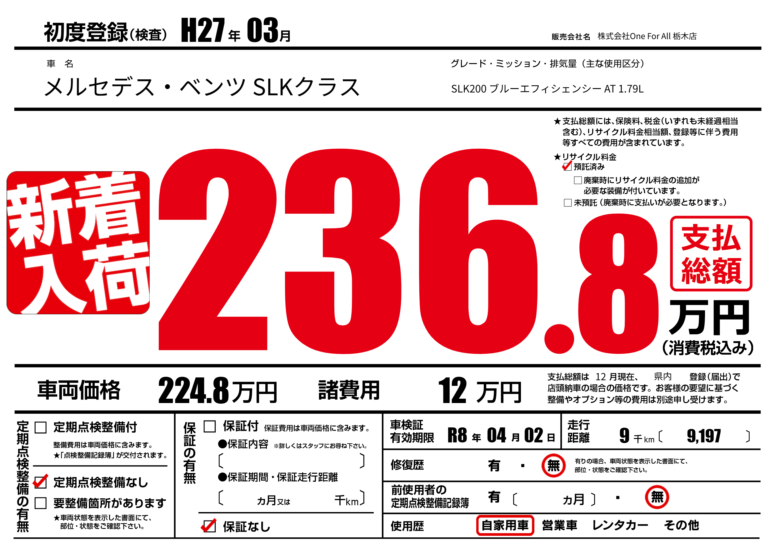 | 車名 | メルセデス・ベンツ SLKクラス | グレード ミッション 排気量 |