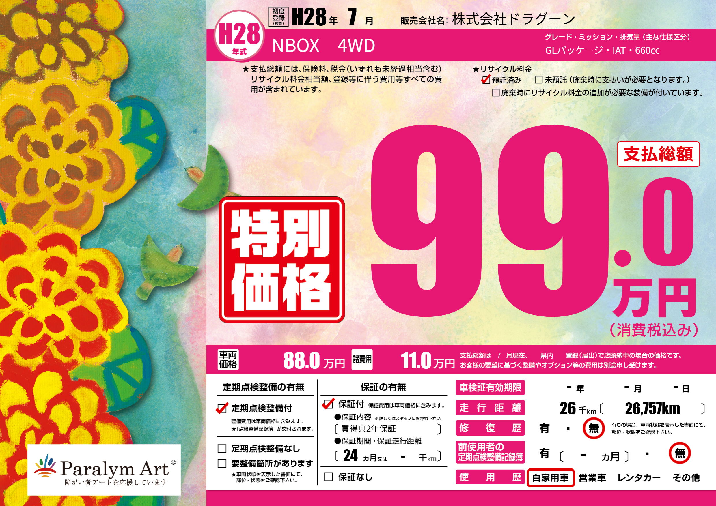 | 車名 | NBOX 4WD | グレード ミッション 排気量 |