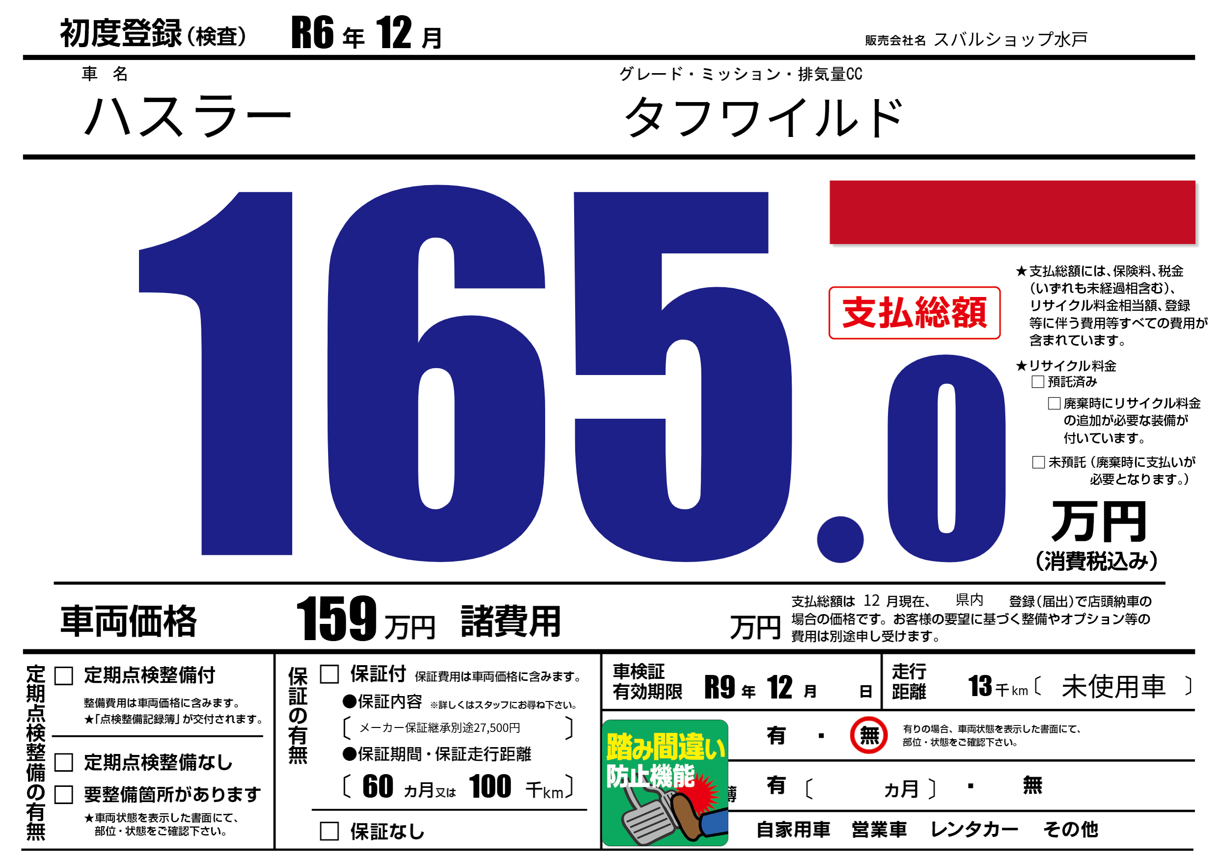 なし | 車検制限 | R9年12月---月 |