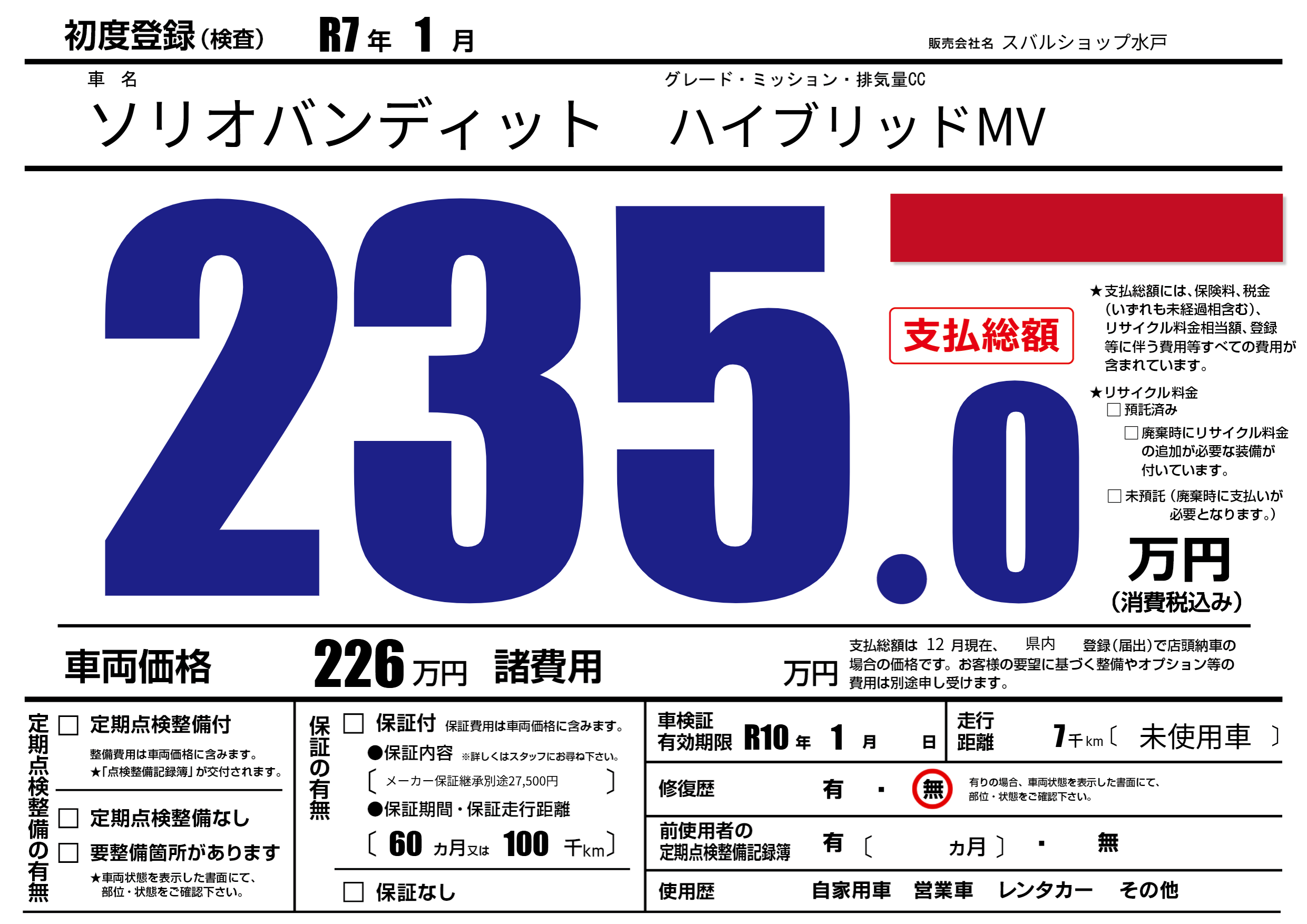 | 走行キロ | 0.7万km | 初年度登録 | R7年1月 |