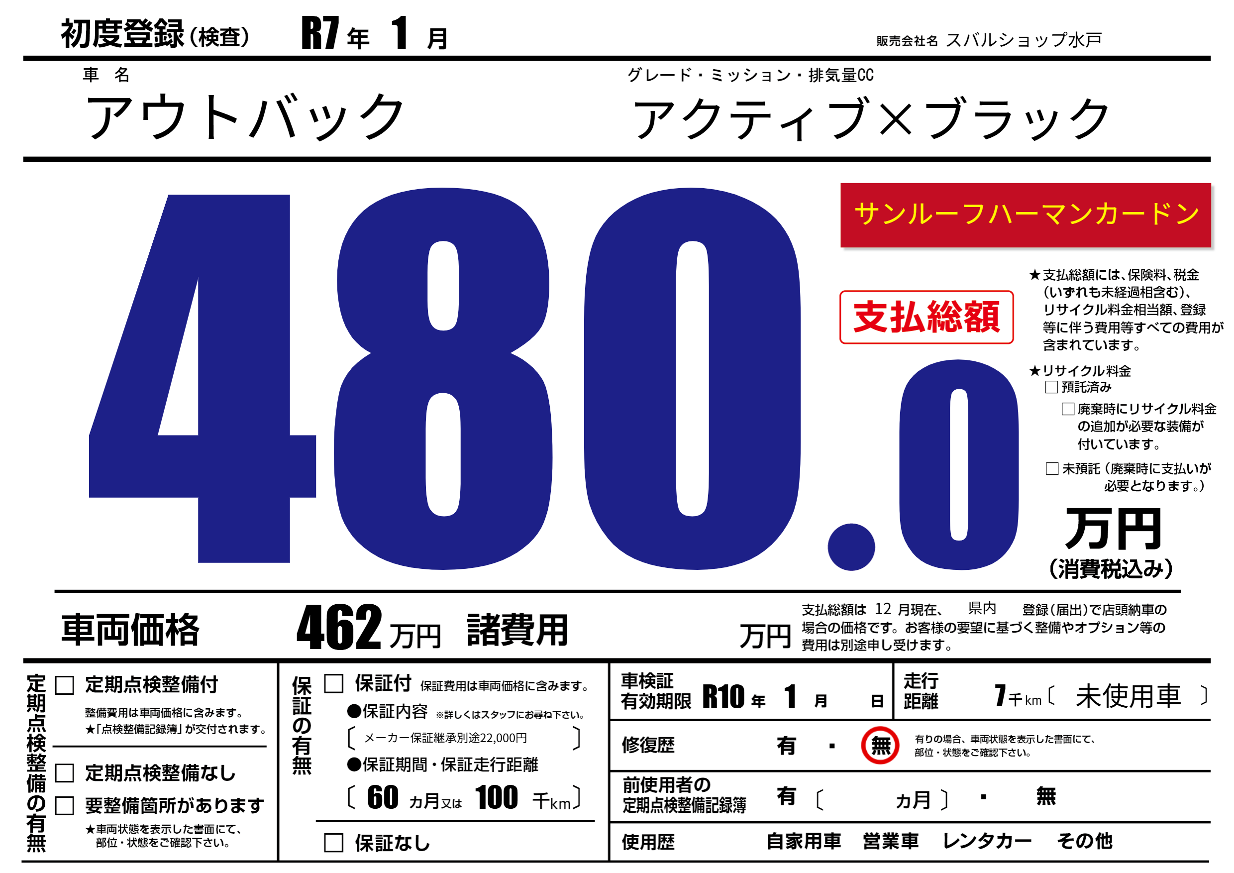 | 車名 | アウトバック | グレード ミッション 排気量 |