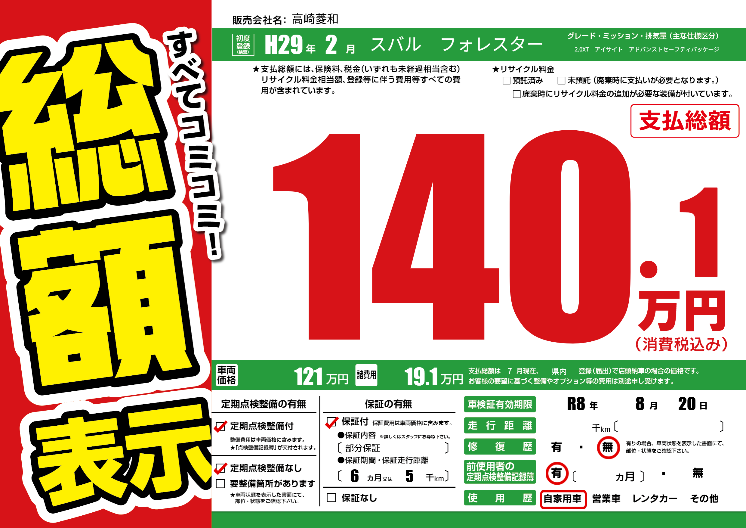 | 車名 | スバル フォレスター | グレード ミッション 排気量 |