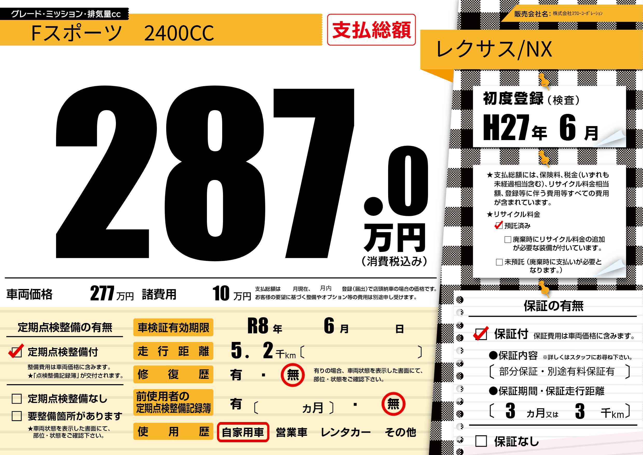 | 車検制限 | R8年 6月 - 日 | ||