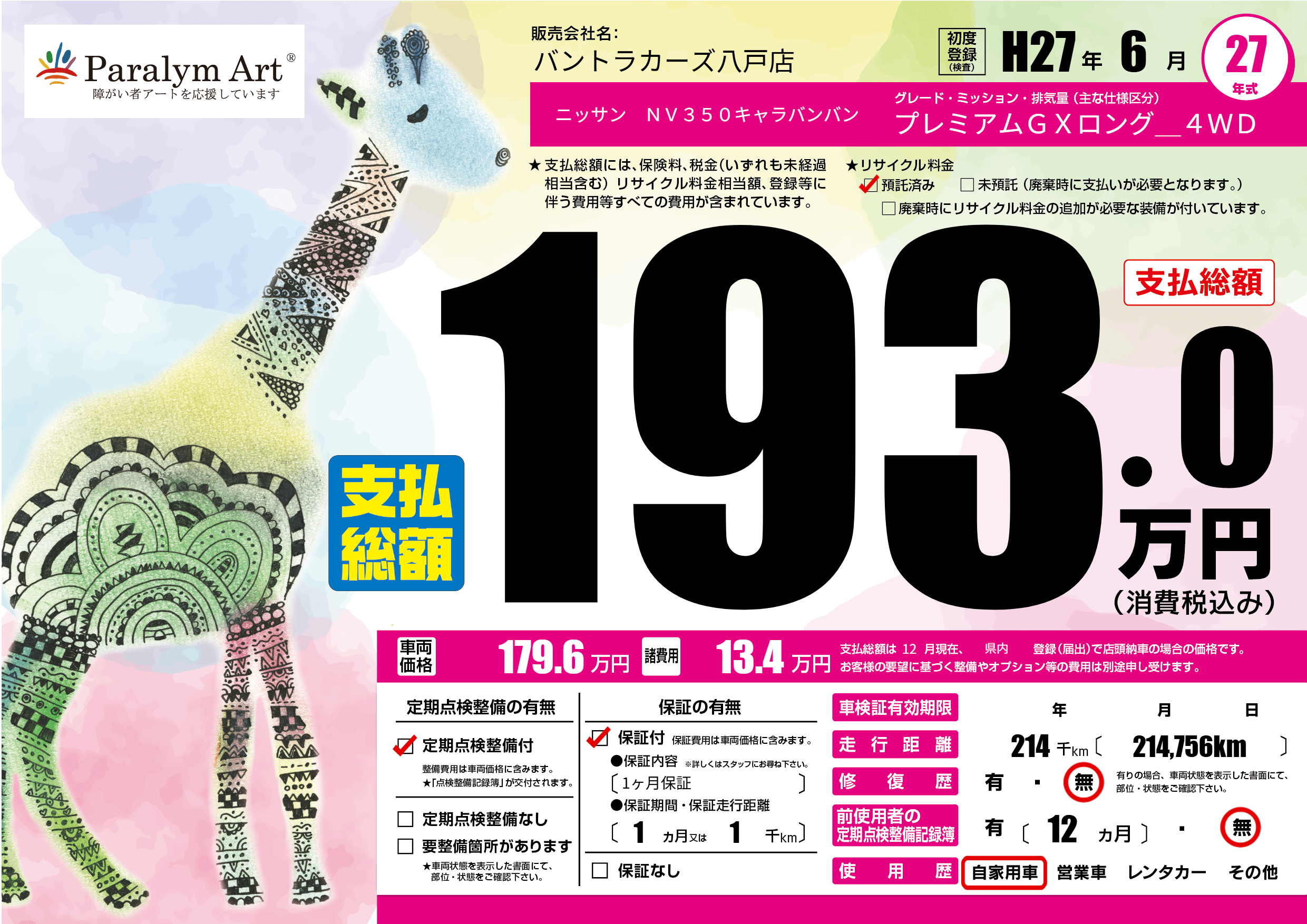 | 車名 | ニッサン NV350キャラバンバン | グレード ミッション 排気量 |
