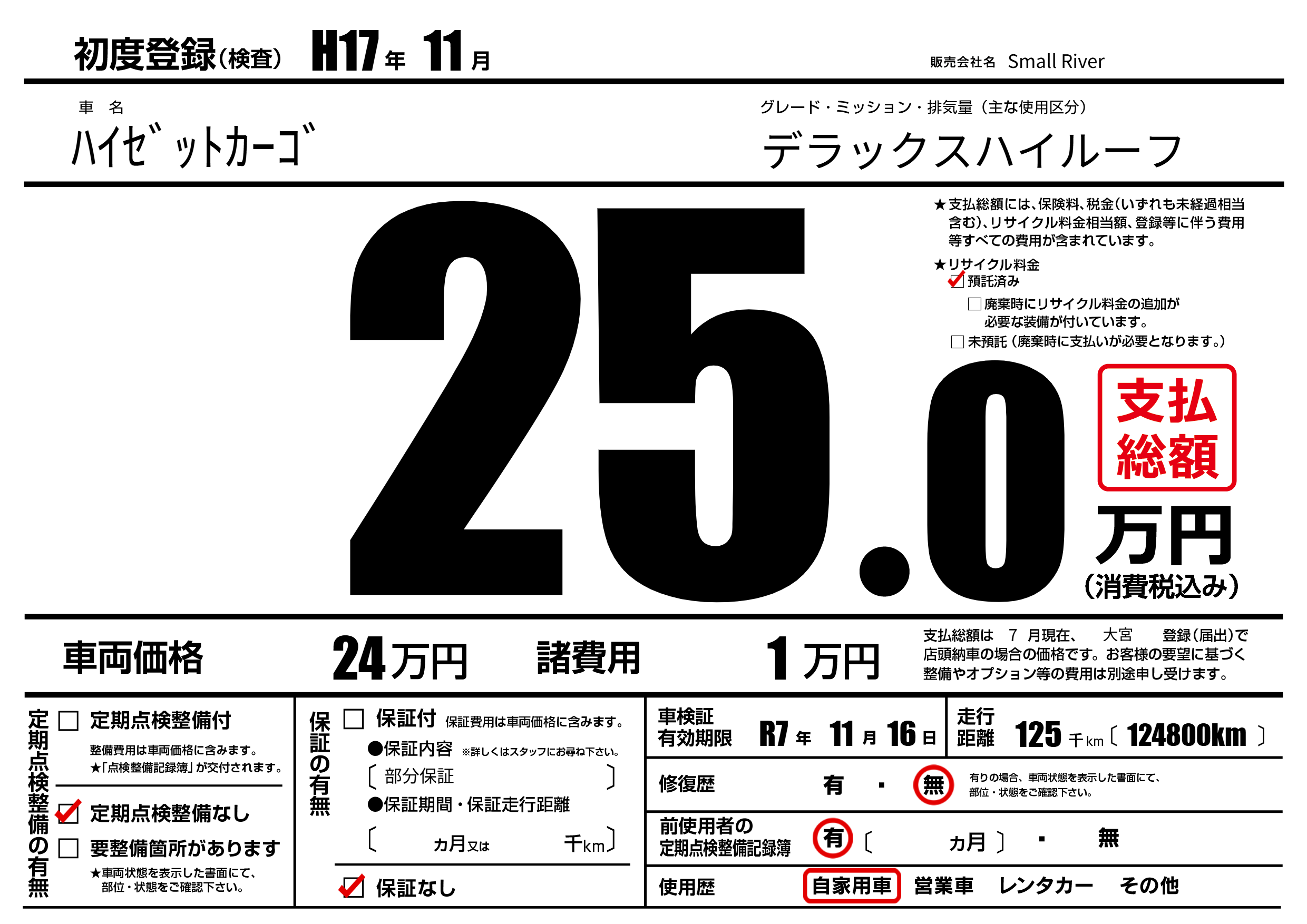 | 走行キロ | 12.5万km | 初年度登録 | H17年11月 |