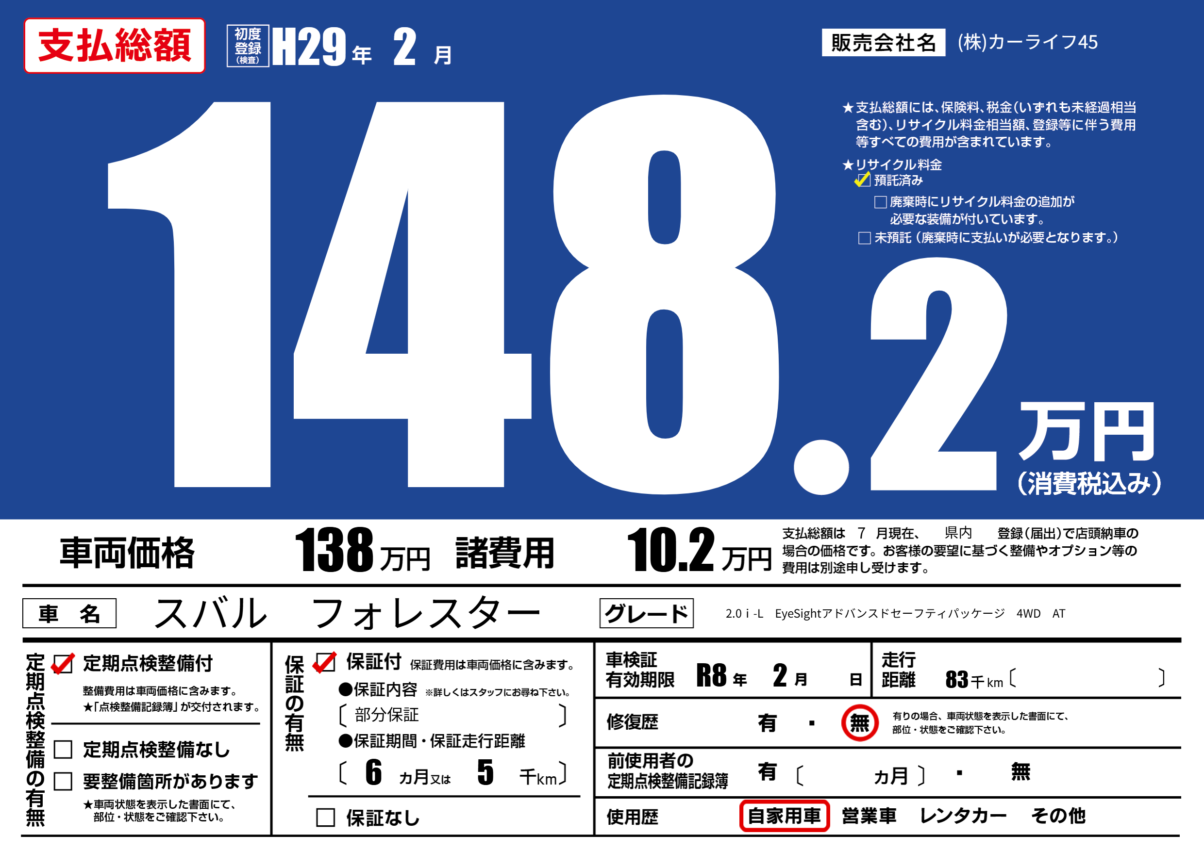 | 車名 | スバル フォレスター | グレード ミッション 排気量 |