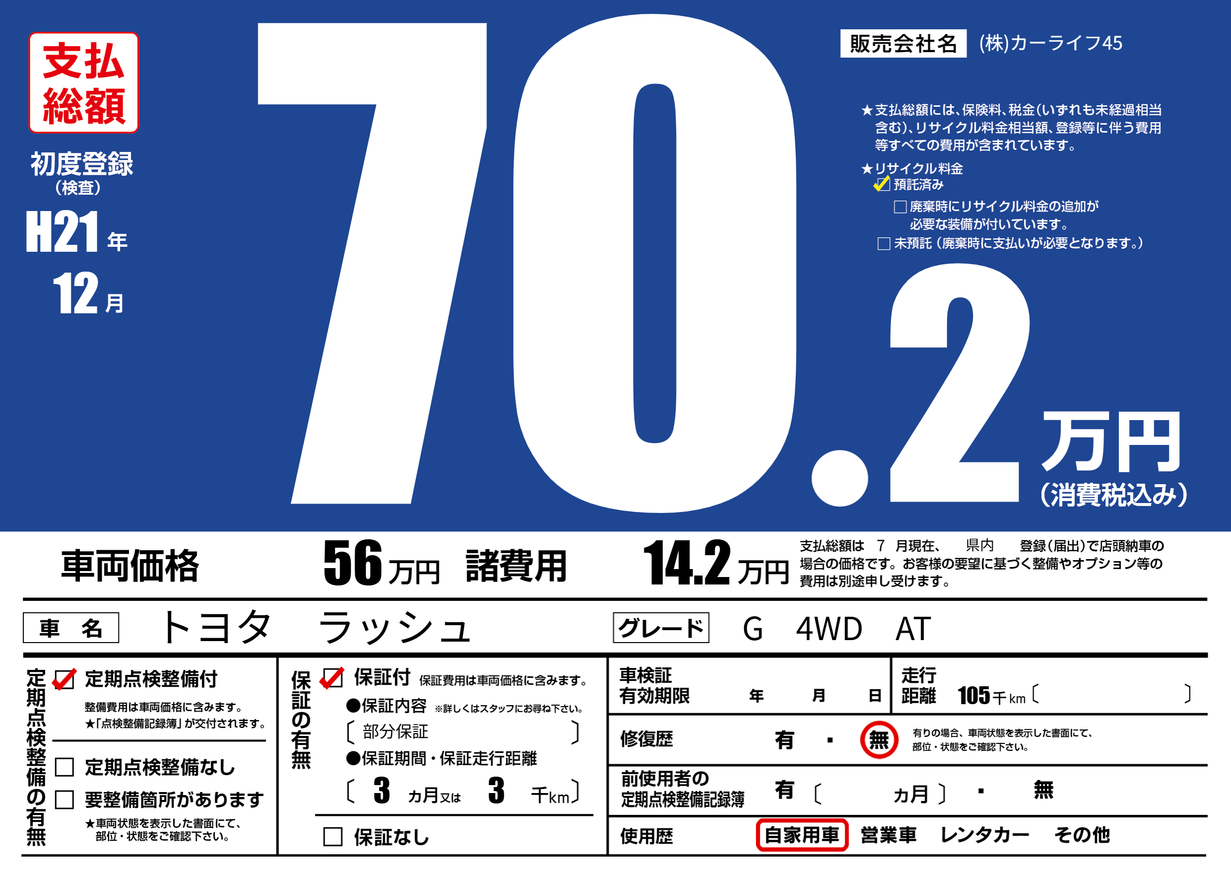| 車名 | トヨタ ラッシュ | グレード ミッション 排気量 |