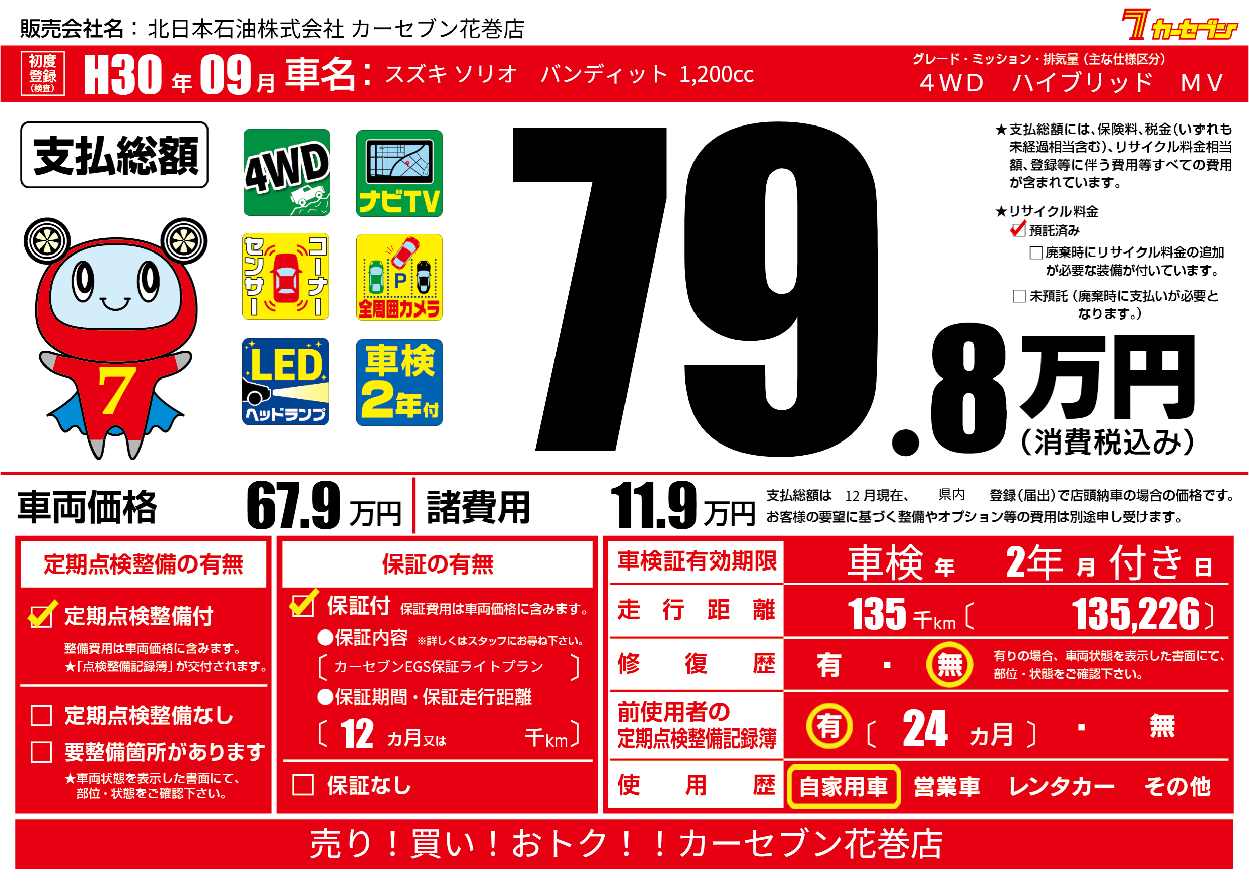 | 走行キロ | 13.5万km | 初年度登録 | H30年09月 |